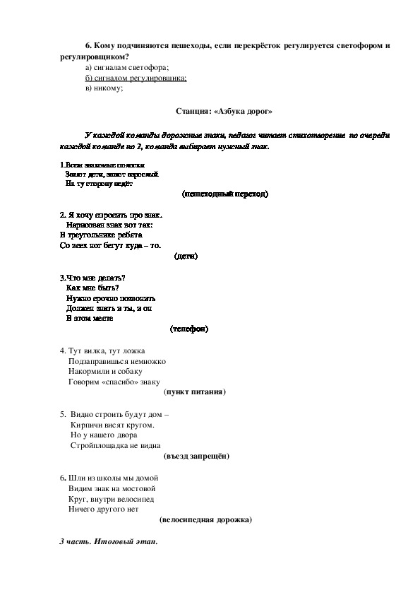 У каждой команды дорожные знаки, педагог читает стихотворение по очереди