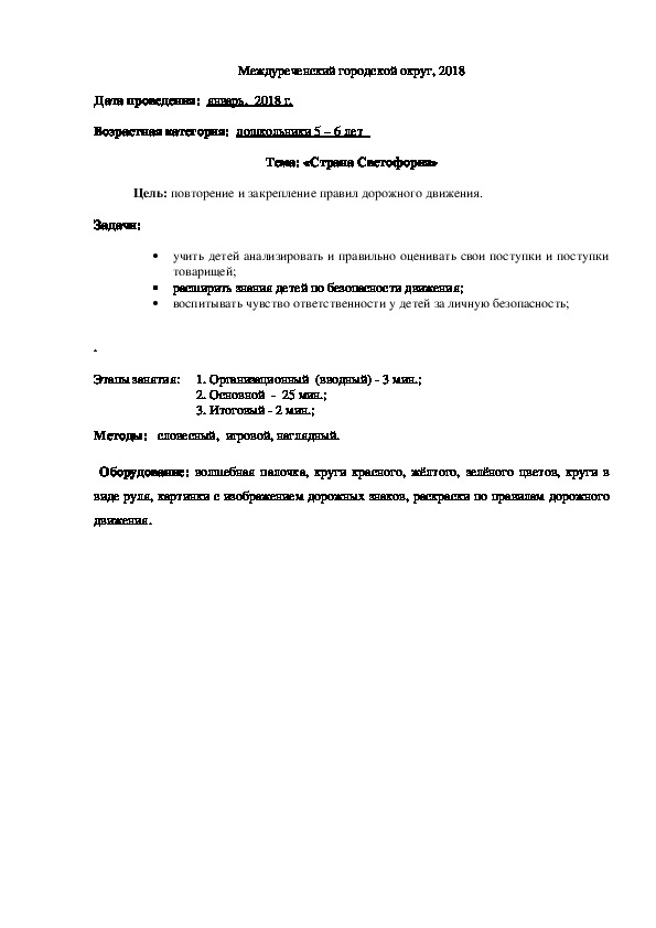 Данная разработка познавательно - игровой программы рассчитана для детей дошкольного возраста с целью закрепления ПДД. При помощи "волшебной" палочки ребята погружаются в увлекательное путешествие в страну "Светофория" по разным станциям и знакомятся с "жителями " этой загадочной страны. Ведь в интересной форме напомнить о правилах дорожного движения гораздо интереснее, чем монотонные наставления.