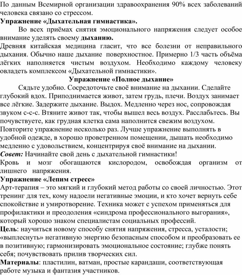 Тест «Скрытый стресс». Всем участникам тренинга выдаются подготовленные бланки тестов. Существует множество советов и психологических приёмов для снятия эмоционального стресса.
