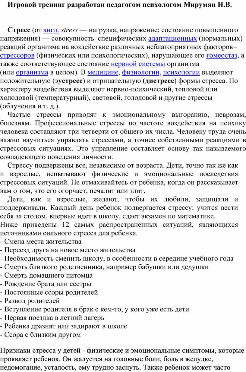 Игровой тренинг разработан педагогом психологом Мирумян Н.В.