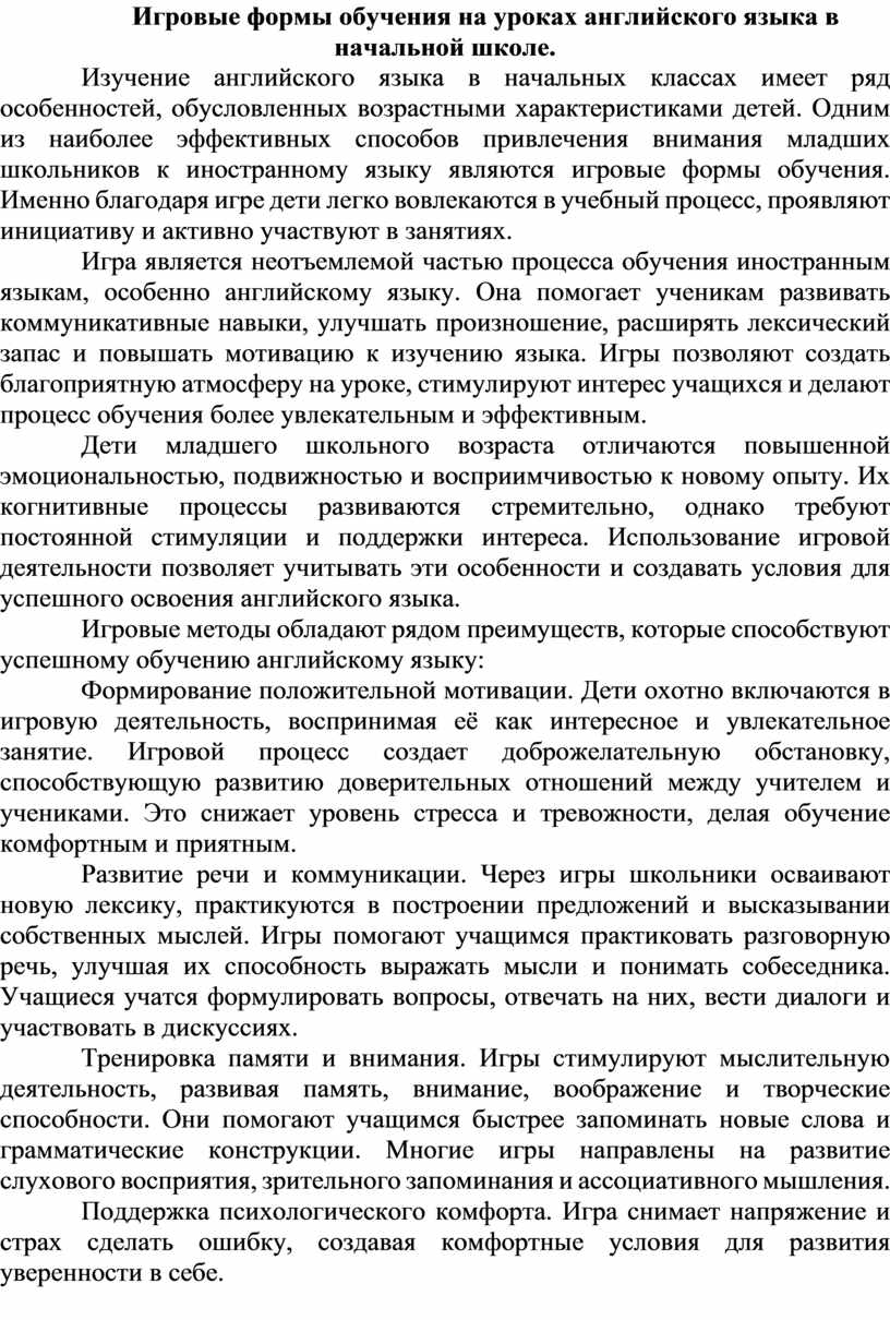 Игровые формы обучения на уроках английского языка в начальной школе.