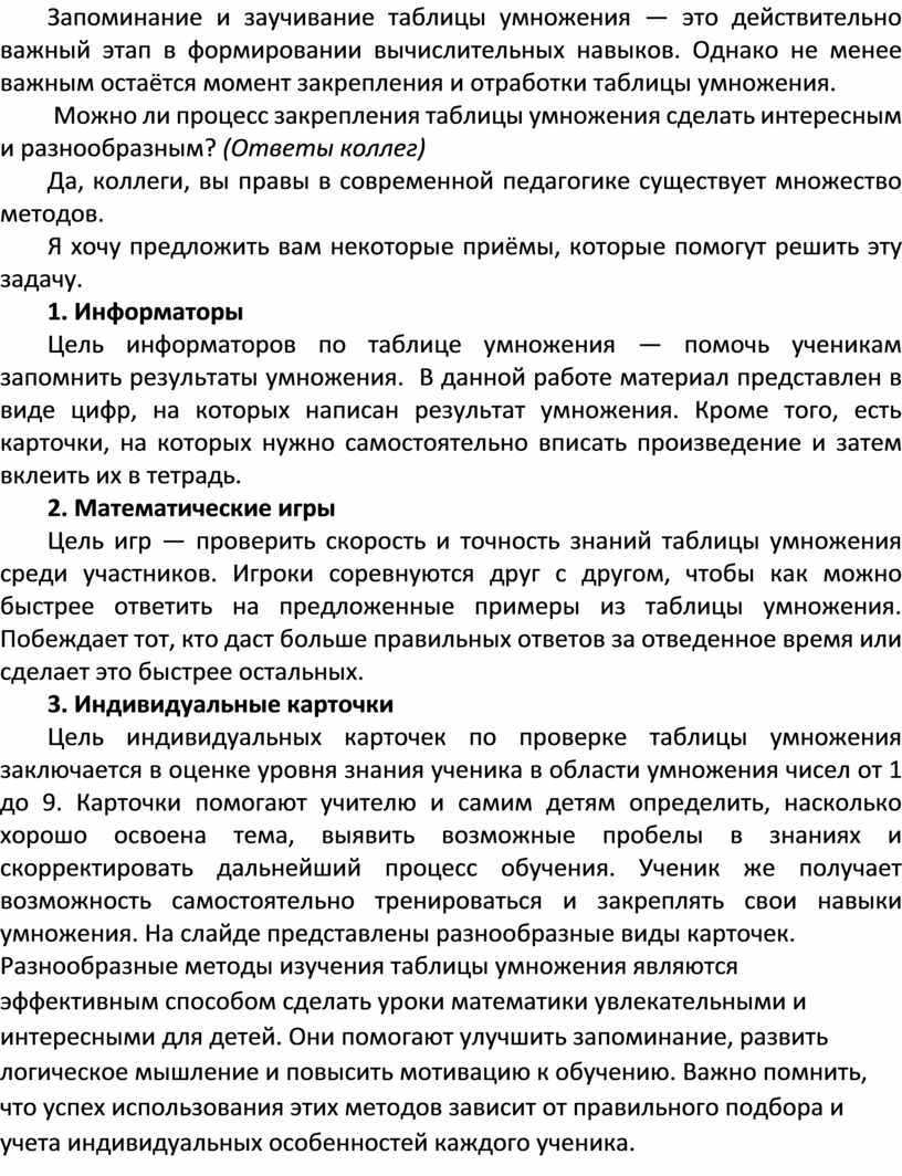 Разнообразные методы изучения таблицы умножения являются эффективным способом сделать уроки математики увлекательными и интересными для детей. Они помогают улучшить запоминание, развить логическое мышление и повысить мотивацию к обучению. Важно помнить, что успех использования этих методов зависит от правильного подбора и учета индивидуальных особенностей каждого ученика.