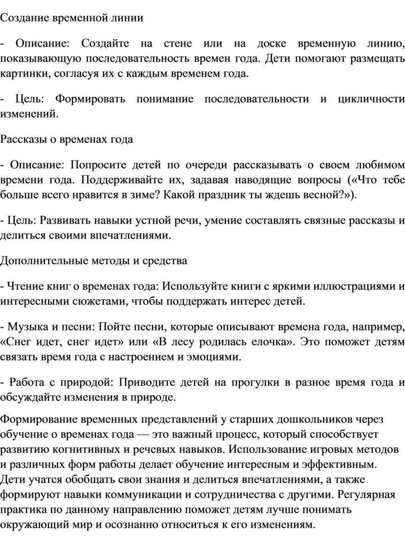 Формирование временных представлений у старших дошкольников через обучение о временах года — это важный процесс, который способствует развитию когнитивных и речевых навыков. Использование игровых методов и различных форм работы делает обучение интересным и эффективным. Дети учатся обобщать свои знания и делиться впечатлениями, а также формируют навыки коммуникации и сотрудничества с другими. Регулярная практика по данному направлению поможет детям лучше понимать окружающий мир и осознанно относиться к его изменениям.