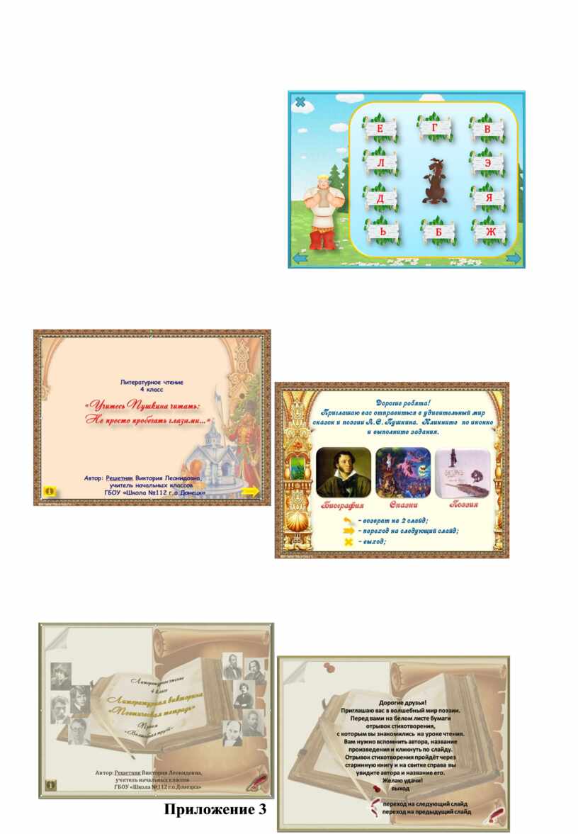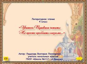 -Для обобщения знаний по творчеству А.С.Пушкина я использую мультимедийный тренажёр «Учитесь Пушкина читать: Не просто пробегать глазами…». С помощью этого тренажёра можно проверить знания биографии поэта, его творчества.