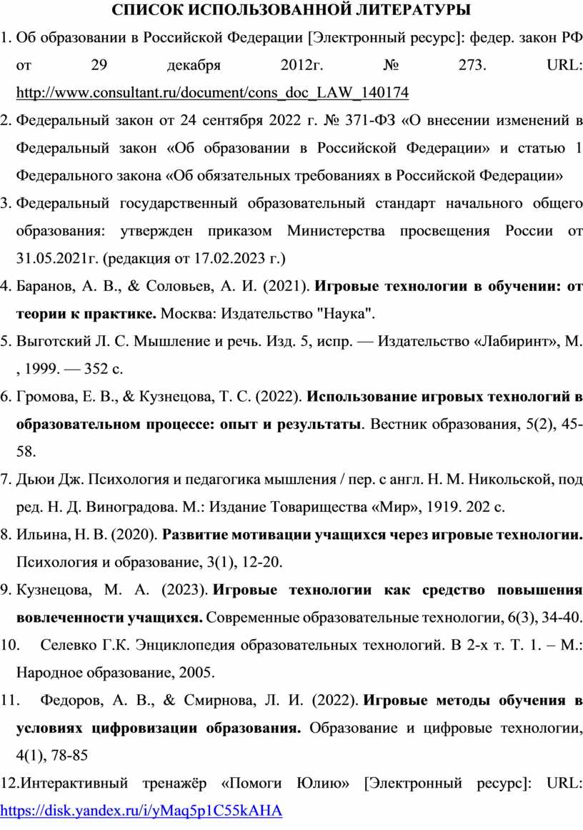 6. Громова, Е. В., & Кузнецова, Т. С. (2022). Использование игровых технологий в образовательном процессе: опыт и результаты. Вестник образования, 5(2), 45-58.