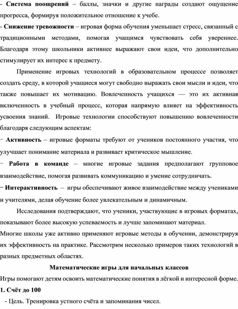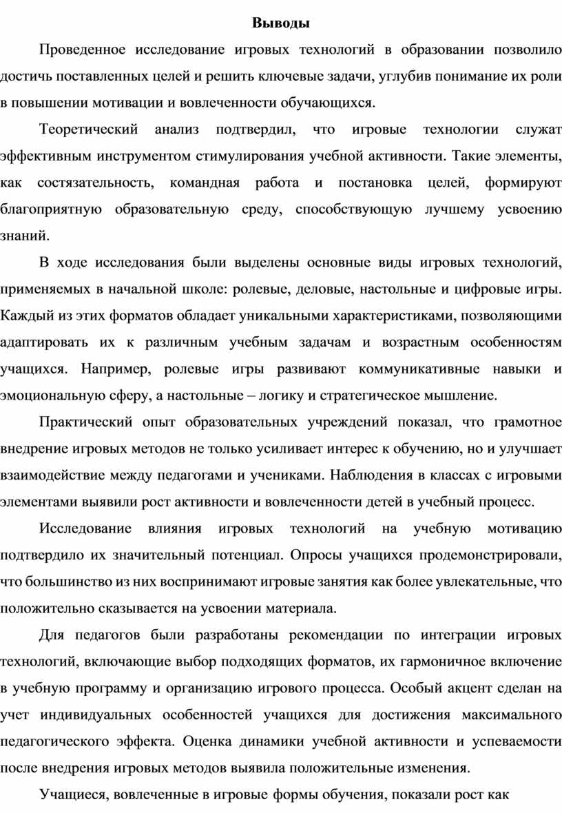 Таким образом, грамотное применение игровых технологий в начальной школе позволяет гармонично сочетать естественную познавательную активность детей с задачами систематического образования, создавая прочную основу для дальнейшего обучения.