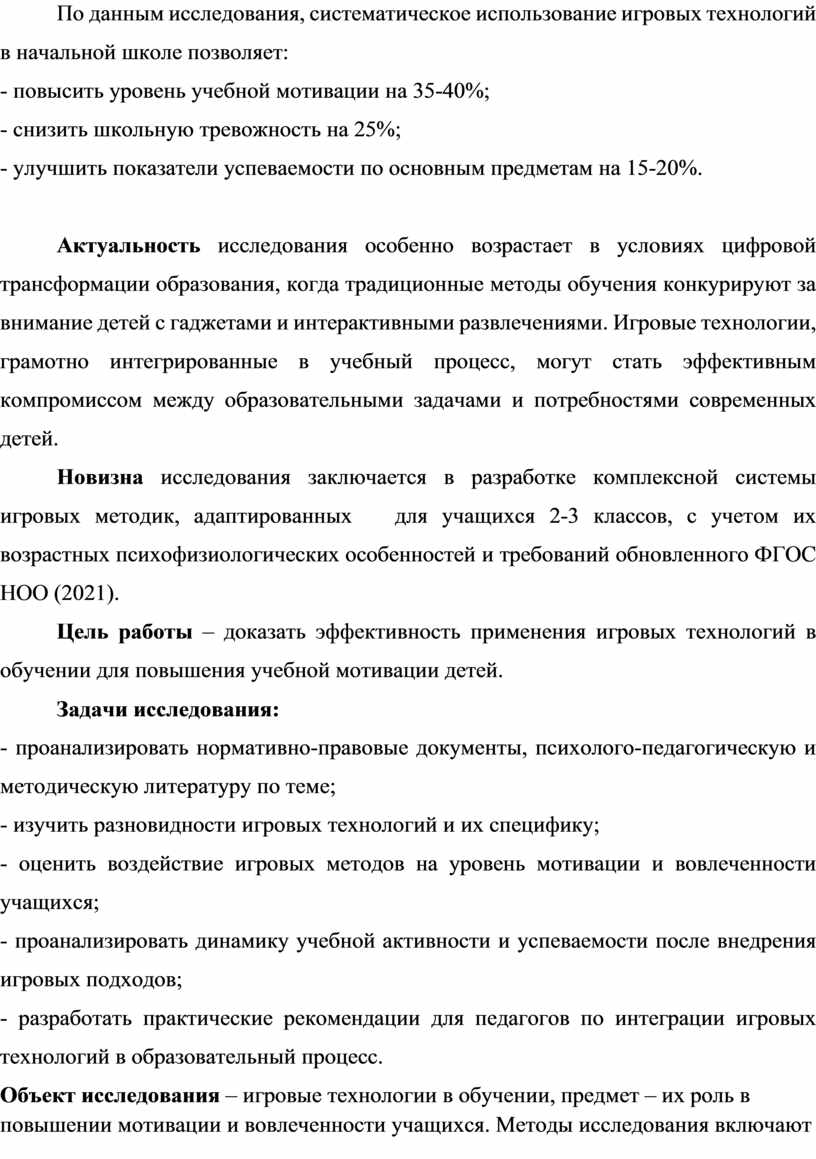Объект исследования – игровые технологии в обучении, предмет – их роль в повышении мотивации и вовлеченности учащихся. Методы исследования включают анализ литературы, наблюдение, анкетирование и изучение практического опыта применения игровых технологий в образовательных учреждениях.