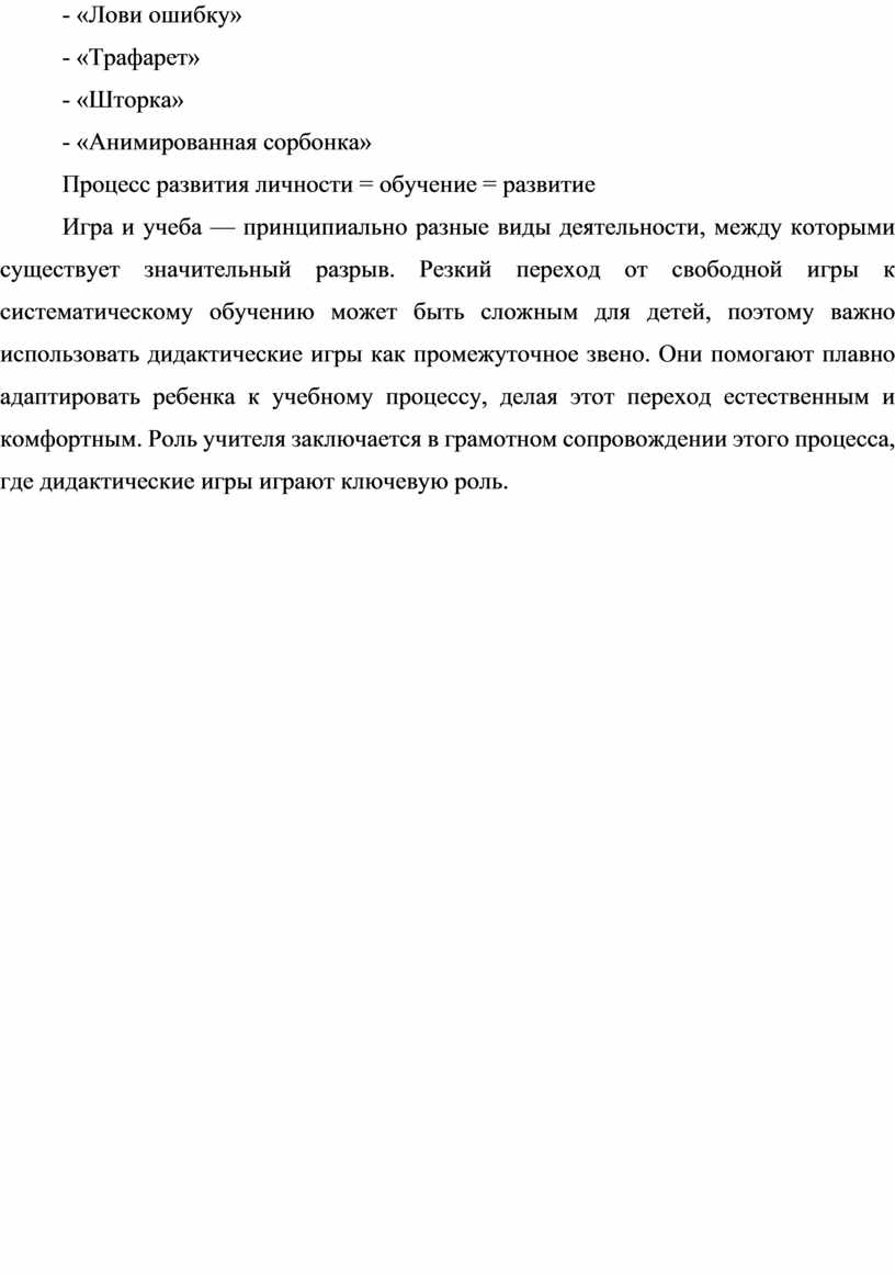 Хотя игра традиционно считается ведущей деятельностью дошкольного периода, ее значение сохраняется и при переходе в школьный возраст. Для первоклассников интеграция игровых элементов в учебный процесс становится важным условием успешной адаптации, помогая мягко входить в новую социальную роль и понимать требования образовательной среды.