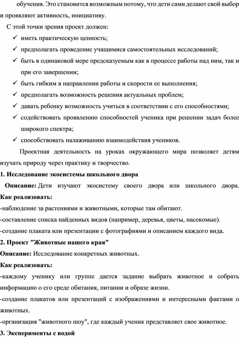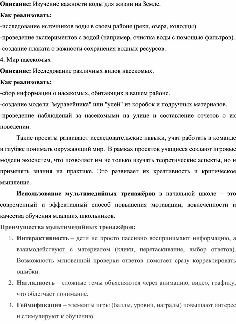 Такие проекты развивают исследовательские навыки, учат работать в команде и глубже понимать окружающий мир. В рамках проектов учащиеся создают игровые модели экосистем, что позволяет им не только изучать теоретические аспекты, но и применять знания на практике. Это развивает их креативность и критическое мышление.