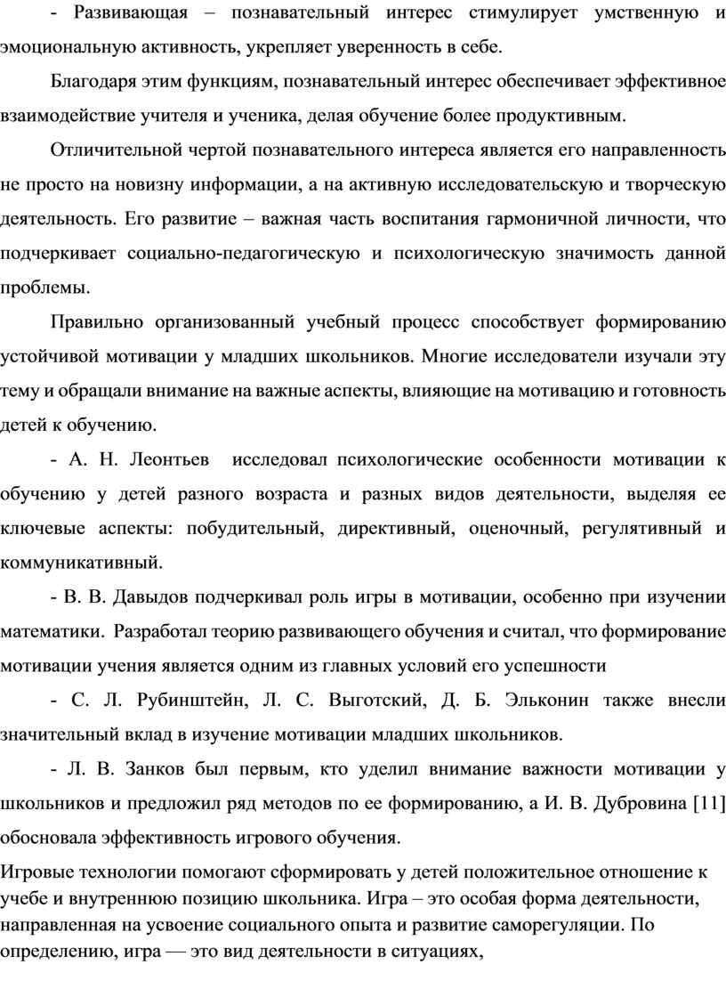 - Л. В. Занков был первым, кто уделил внимание важности мотивации у школьников и предложил ряд методов по ее формированию, а И. В. Дубровина [11] обосновала эффективность игрового обучения.