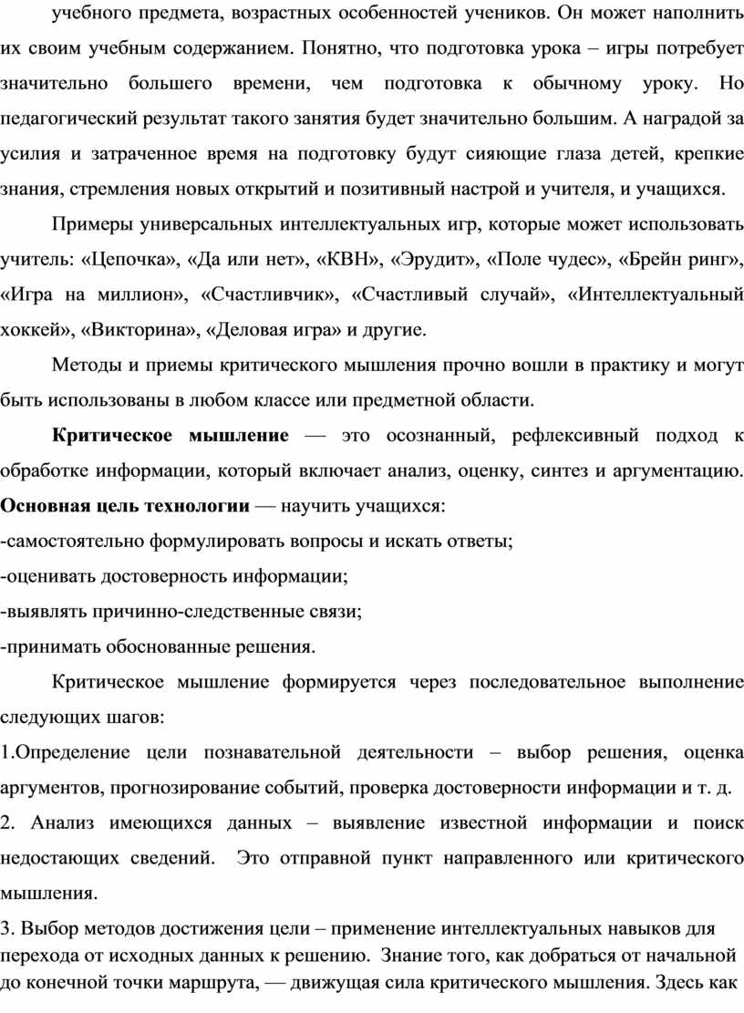 Критическое мышление — это осознанный, рефлексивный подход к обработке информации, который включает анализ, оценку, синтез и аргументацию. Основная цель технологии — научить учащихся:
