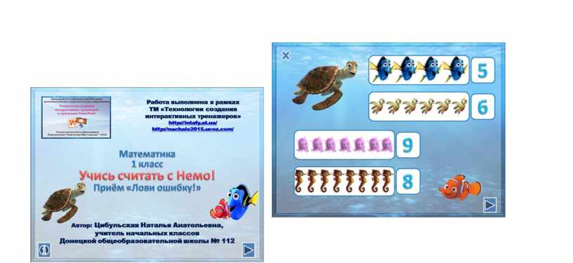 - На уроках математики в 1 классе я использую интерактивный тренажёр «Учись считать с Немо!». Данный тренажёр создан с использованием технологического приёма «Лови ошибку». Его можно использовать для закрепления счёта в пределах 10. Данный тренажёр озвучен.