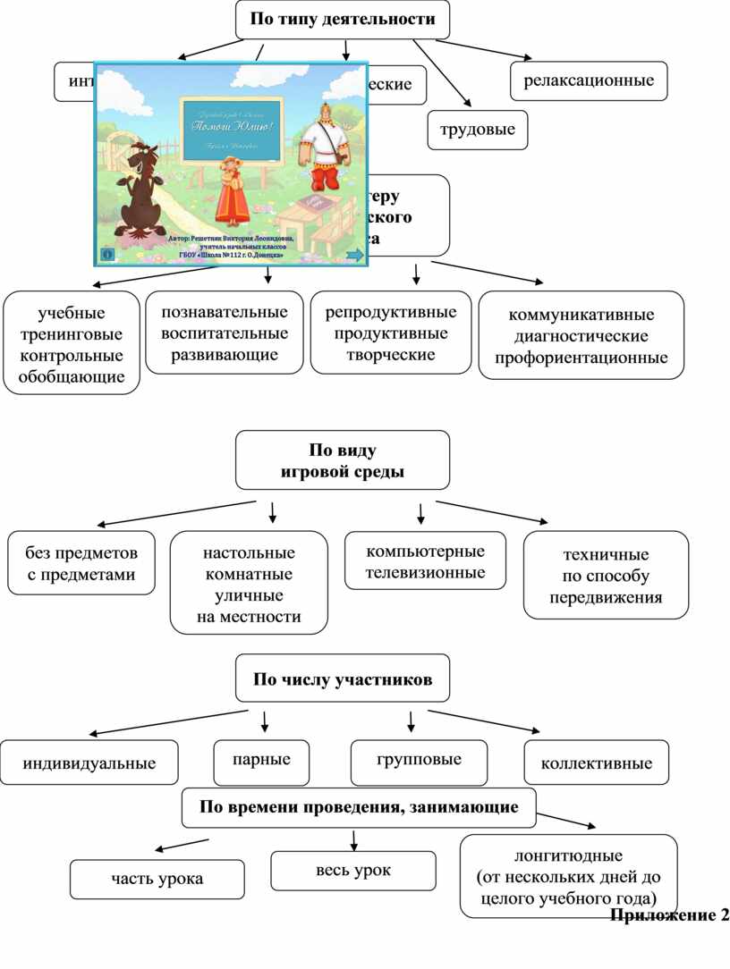 Игры делятся по: типу деятельности, по характеру педагогического процесса, по игровой методике, по виду игровой среды, по числу участников, по времени проведения.( Приложение 1)