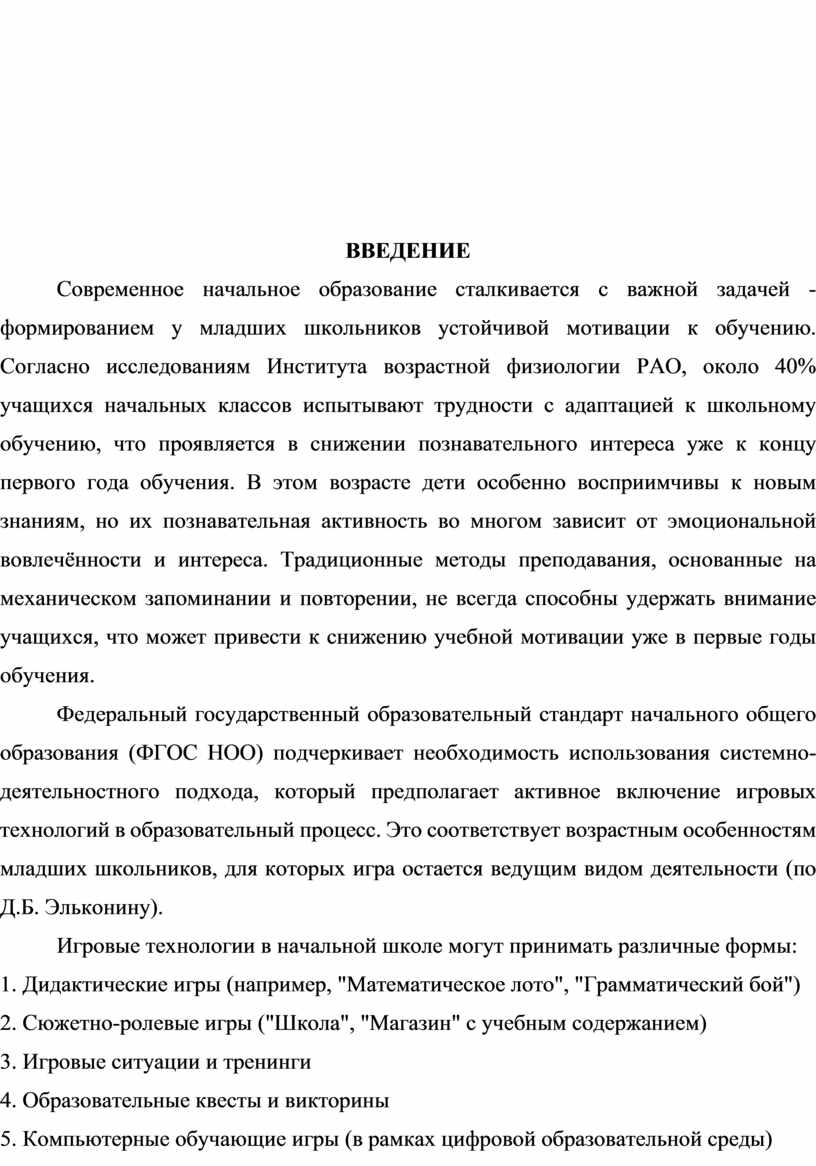 Федеральный государственный образовательный стандарт начального общего образования (ФГОС НОО) подчеркивает необходимость использования системно-деятельностного подхода, который предполагает активное включение игровых технологий в образовательный процесс. Это соответствует возрастным особенностям младших школьников, для которых игра остается ведущим видом деятельности (по Д.Б. Эльконину).