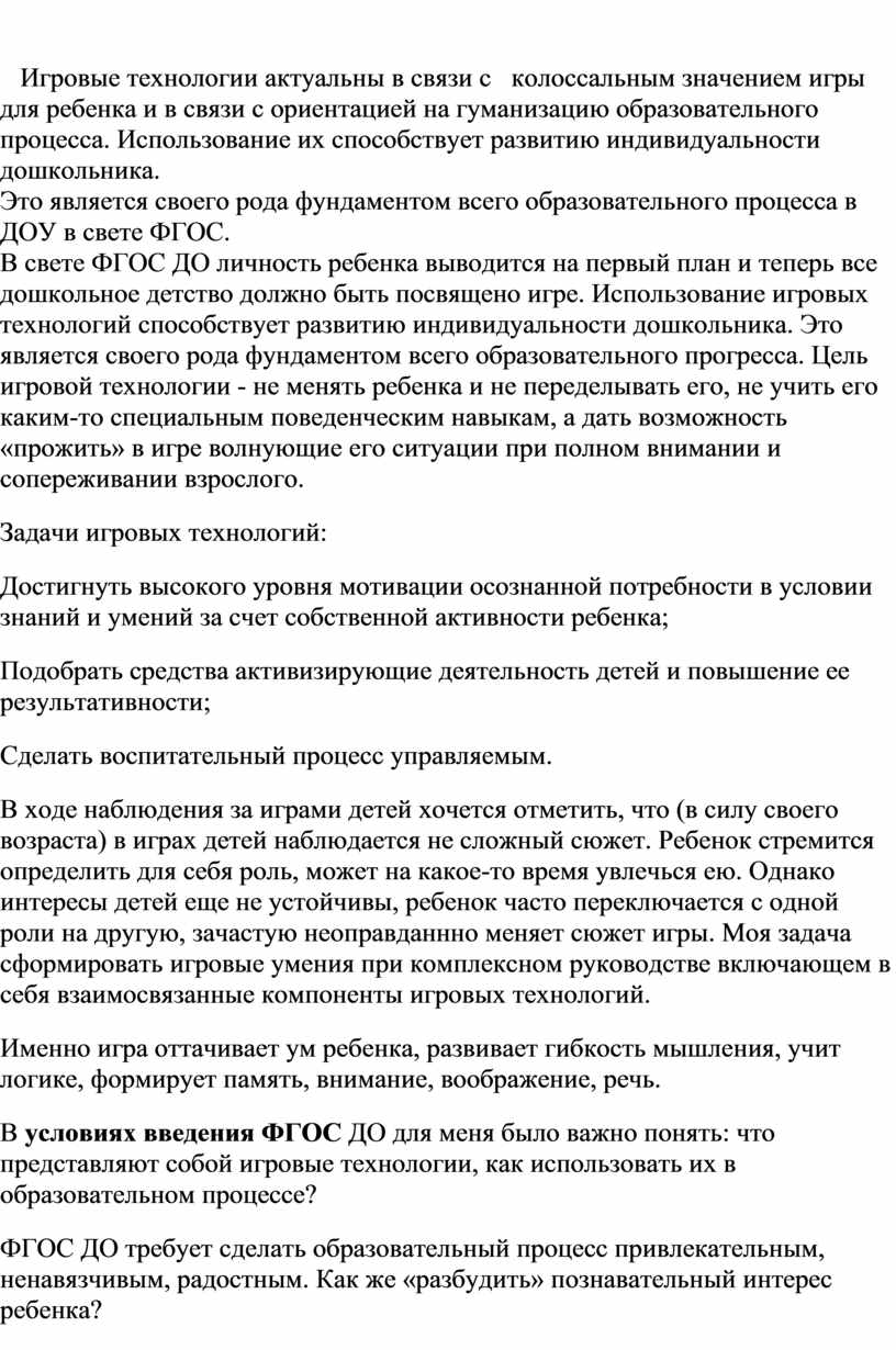 В свете ФГОС ДО личность ребенка выводится на первый план и теперь все дошкольное детство должно быть посвящено игре. Использование игровых технологий способствует развитию индивидуальности дошкольника. Это является своего рода фундаментом всего образовательного прогресса. Цель игровой технологии - не менять ребенка и не переделывать его, не учить его каким-то специальным поведенческим навыкам, а дать возможность «прожить» в игре волнующие его ситуации при полном внимании и сопереживании взрослого.