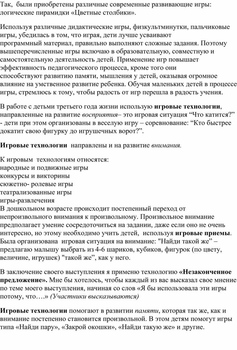 Сначала игровые технологии использовала, как отдельные игровые моменты – это «Бабушкины блины» (бабушка пекла блины, большие и маленькие. Большие для мамы с папой, маленькие для внуков. Но все блины перепутались. Нужно помочь бабушке разложить блины по тарелкам.) Они очень важны в педагогическом процессе, особенно в период адаптации детей в детском учреждении. Моя основная задача - это формирование эмоционального контакта, доверия детей ко мне, умения видеть в воспитателе доброго, всегда готового прийти на помощь человека (как мама), интересного партнера в игре.