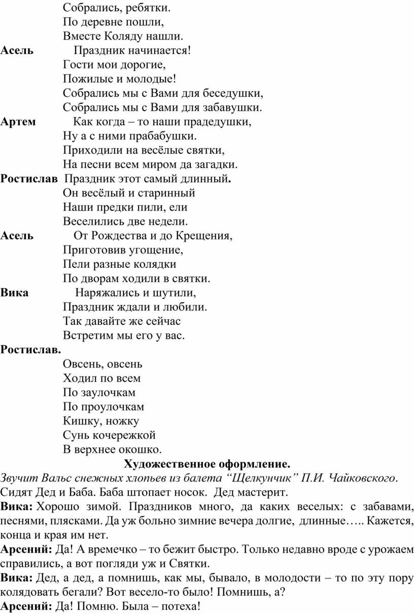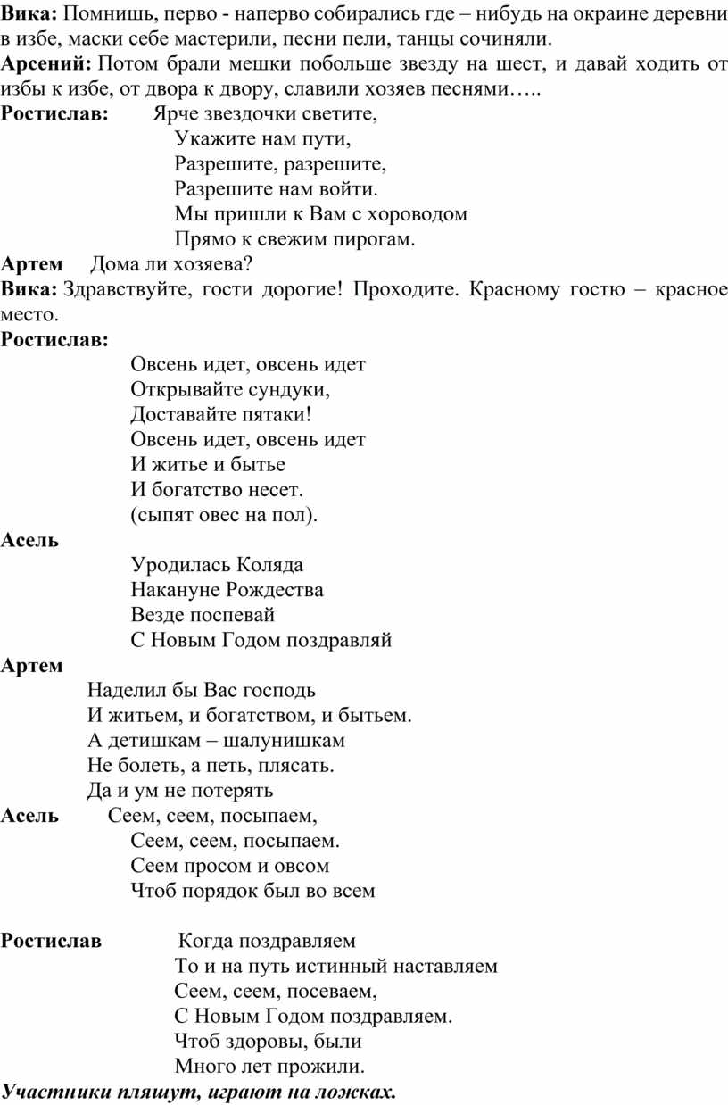 Вика: Дед, а дед, а помнишь, как мы, бывало, в молодости – то по эту пору колядовать бегали? Вот весело-то было! Помнишь, а?