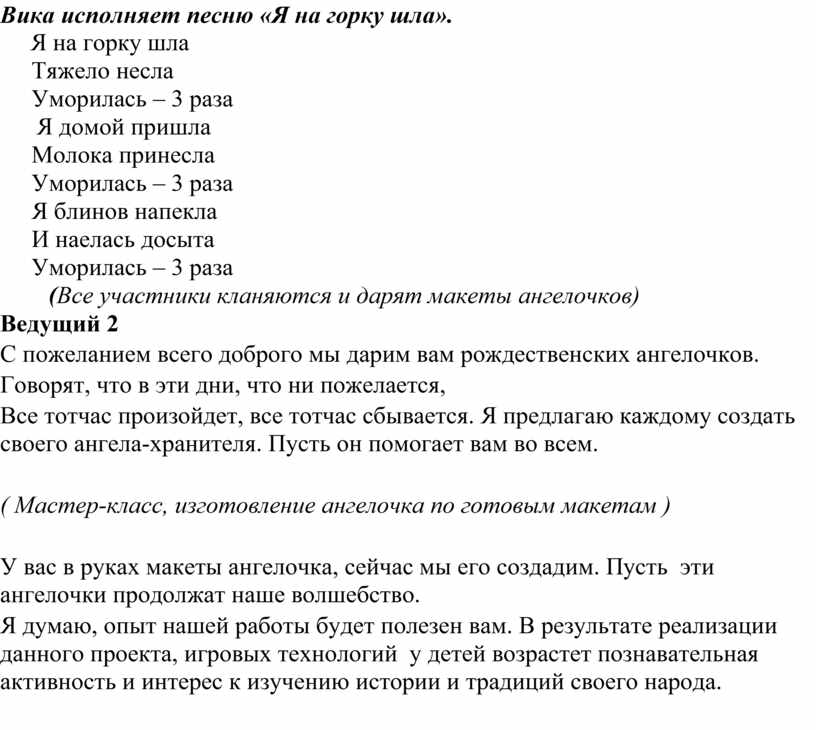 Результат проекта: Проведение праздничного представления «Рождественские колядки». Внедрение проекта в воспитательно-образовательный проект обеспечило развитие у детей любознательности, стремление изучить традиции родной страны. Работа по проекту помогла развить у них кругозор, эстетическую восприимчивость. Дети получили возможность почувствовать себя свободными, раскрепощенными, обрели уверенность в себе, в своих силах, в умении мыслить, фантазировать. Научились изготавливать куклу - рождественского ангела.