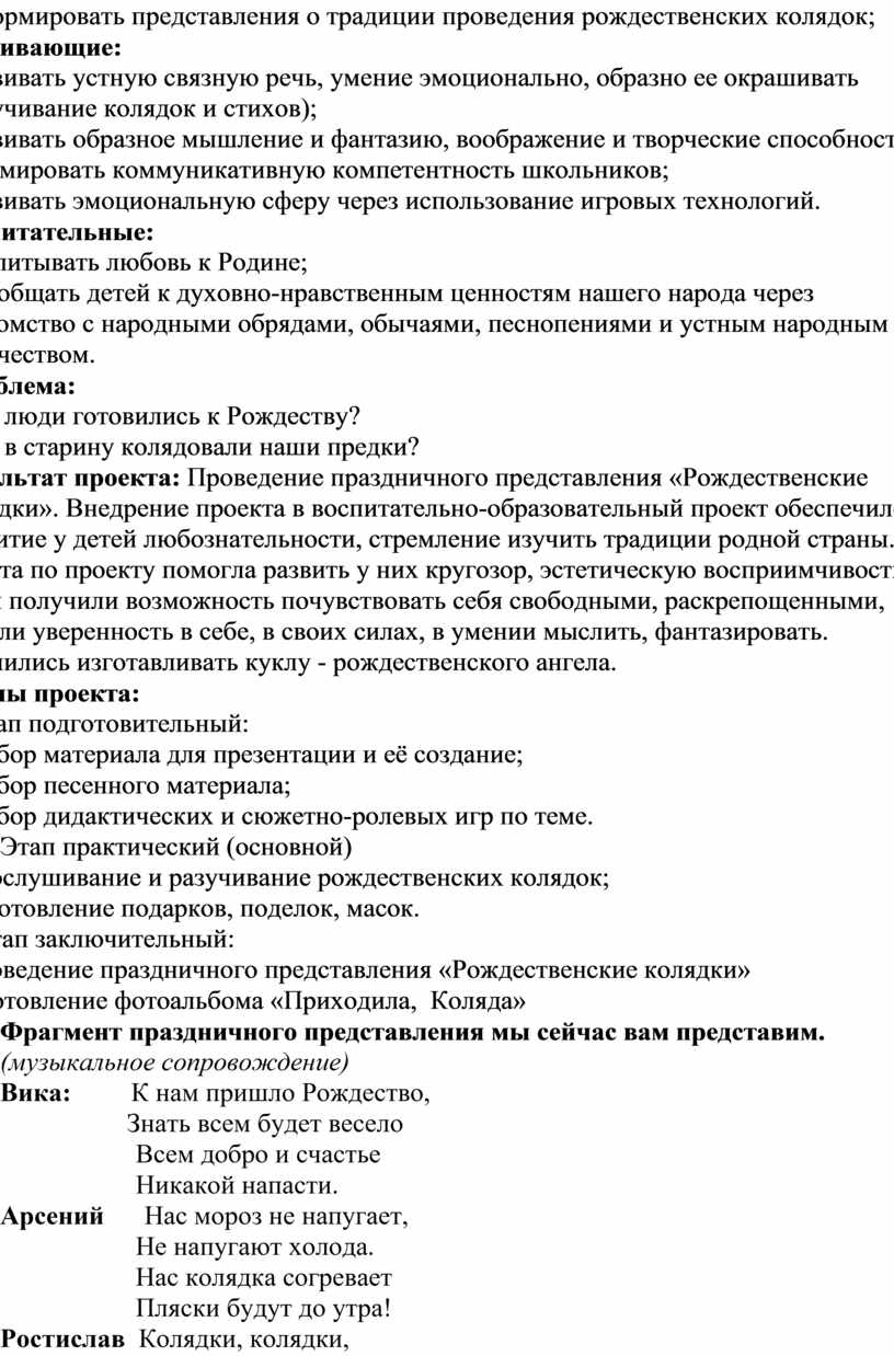 -развивать устную связную речь, умение эмоционально, образно ее окрашивать (разучивание колядок и стихов);