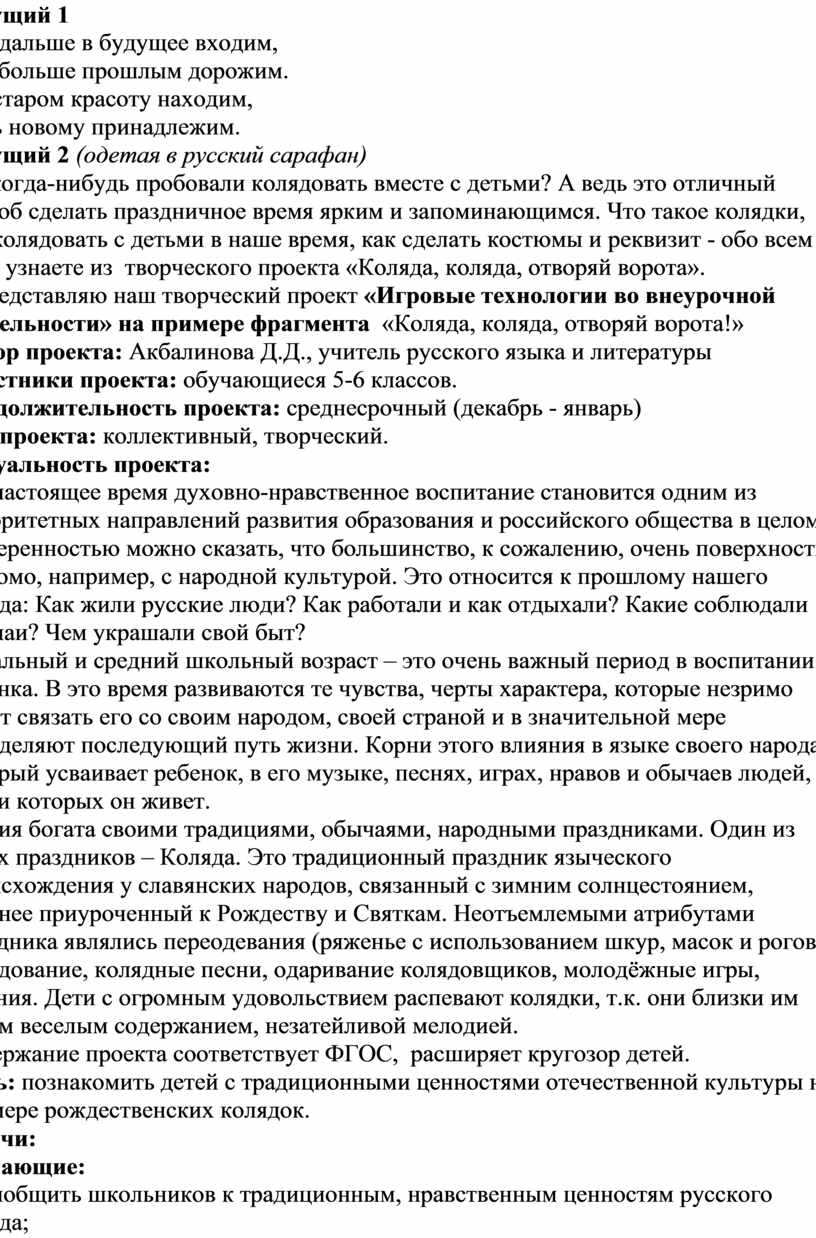 Я представляю наш творческий проект «Игровые технологии во внеурочной деятельности» на примере фрагмента «Коляда, коляда, отворяй ворота!»
