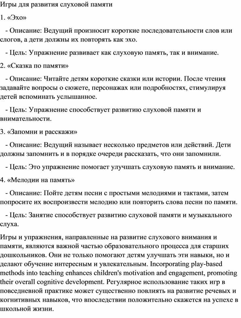 Игры и упражнения, направленные на развитие слухового внимания и памяти, являются важной частью образовательного процесса для старших дошкольников. Они не только помогают детям улучшать эти навыки, но и делают обучение интересным и увлекательным. Incorporating play-based methods into teaching enhances children's motivation and engagement, promoting their overall cognitive development. Регулярное использование таких игр в повседневной практике может существенно повлиять на развитие речевых и когнитивных навыков, что впоследствии положительно скажется на успехе в школьной жизни.