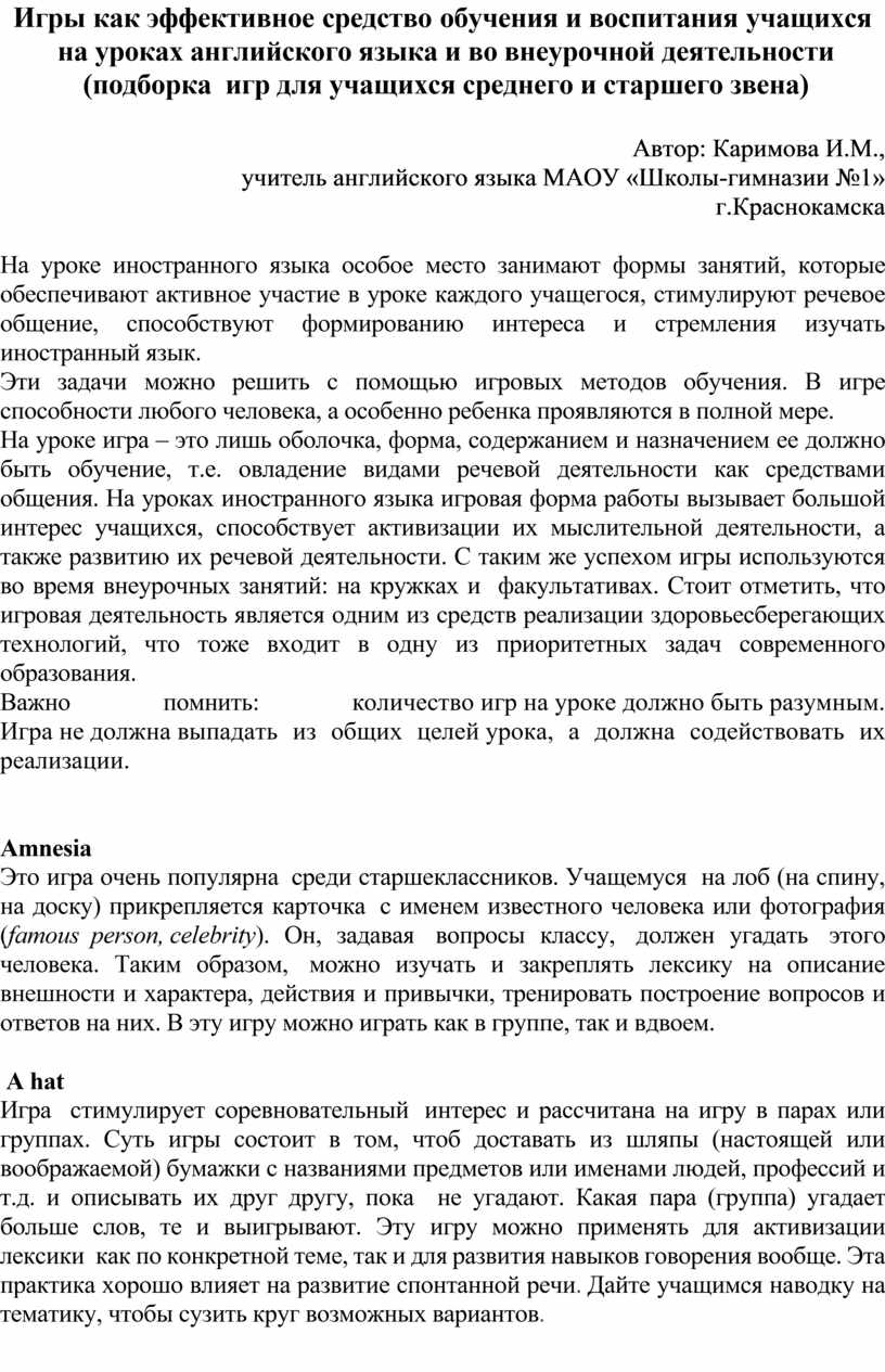 Игры как эффективное средство обучения и воспитания учащихся