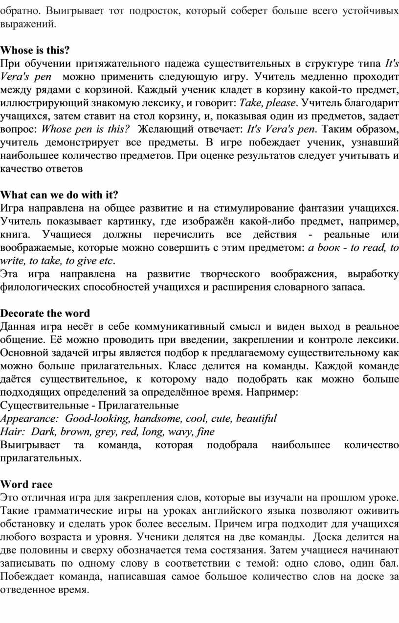 При обучении притяжательного падежа существительных в структуре типа It's Vera's pen можно применить следующую игру. Учитель медленно проходит между рядами с корзиной. Каждый ученик кладет в корзину какой-то предмет, иллюстрирующий знакомую лексику, и говорит: Take, please. Учитель благодарит учащихся, затем ставит на стол корзину, и, показывая один из предметов, задает вопрос: Whose pen is this? Желающий отвечает: It's Vera's pen. Таким образом, учитель демонстрирует все предметы. В игре побеждает ученик, узнавший наибольшее количество предметов. При оценке результатов следует учитывать и качество ответов
