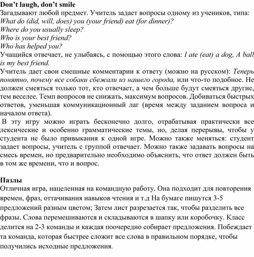 Учитель дает свои смешные комментарии к ответу (можно на русском): Теперь понятно, почему все собаки сбежали из нашего города, или что-то подобное. Не должен смеяться только тот, кто отвечает, а чем больше будут смеяться другие, тем веселее. Темп вопросов не снижать, максимум вопросов. Добиваться быстрых ответов, уменьшая коммуникационный лаг (время между заданием вопроса и началом ответа).