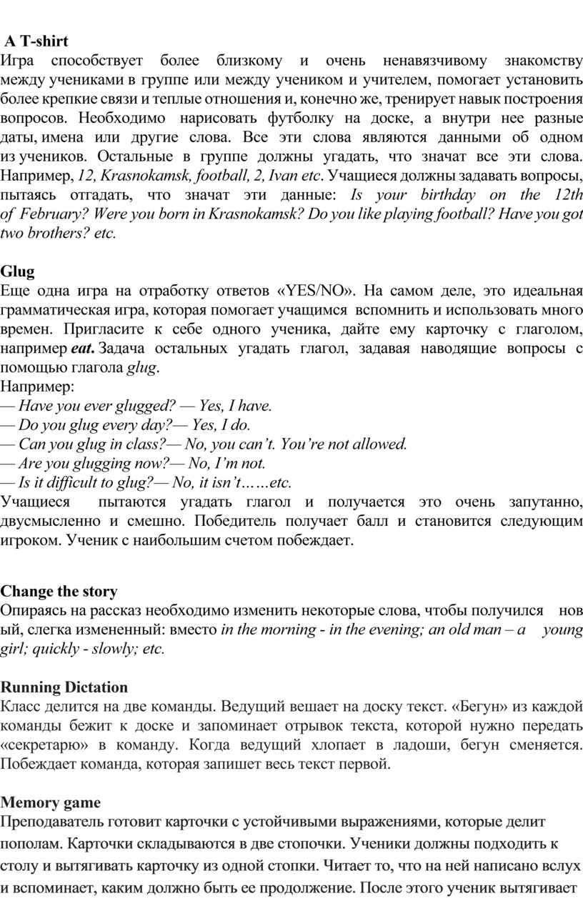 Игра способствует более близкому и очень ненавязчивому знакомству между учениками в группе или между учеником и учителем, помогает установить более крепкие связи и теплые отношения и, конечно же, тренирует навык построения вопросов. Необходимо нарисовать футболку на доске, а внутри нее разные даты, имена или другие слова. Все эти слова являются данными об одном из учеников. Остальные в группе должны угадать, что значат все эти слова. Например, 12, Krasnokamsk, football, 2, Ivan etc. Учащиеся должны задавать вопросы, пытаясь отгадать, что значат эти данные: Is your birthday on the 12th of February? Were you born in Krasnokamsk? Do you like playing football? Have you got two brothers? etc.