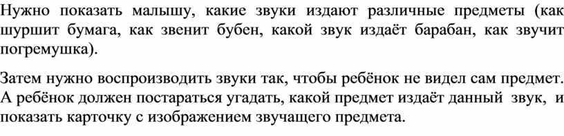 Нужно показать малышу, какие звуки издают различные предметы (как шуршит бумага, как звенит бубен, какой звук издаёт барабан, как звучит погремушка).