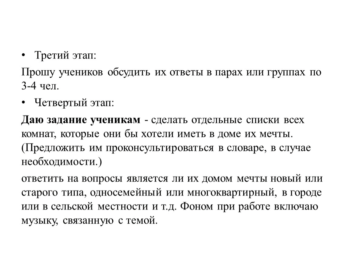Даю задание ученикам - сделать отдельные списки всех комнат, которые они бы хотели иметь в доме их мечты. (Предложить им проконсультироваться в словаре, в случае необходимости.)
