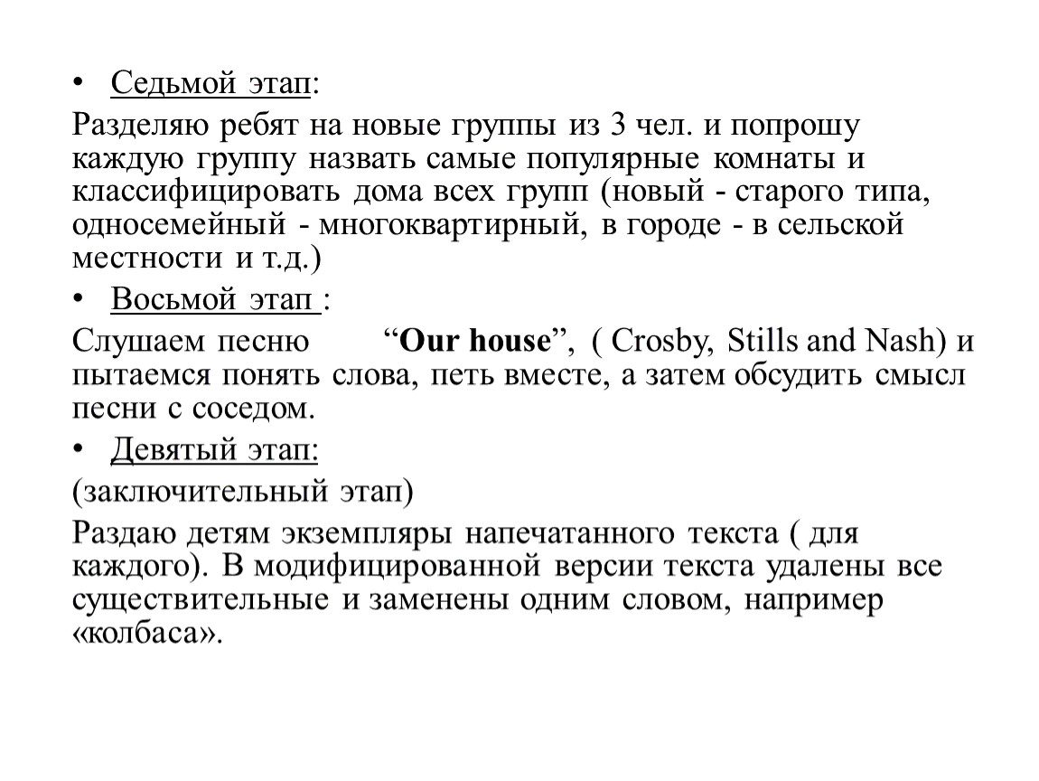 Слушаем песню “Our house”, ( Crosby, Stills and Nash) и пытаемся понять слова, петь вместе, а затем обсудить смысл песни с соседом.