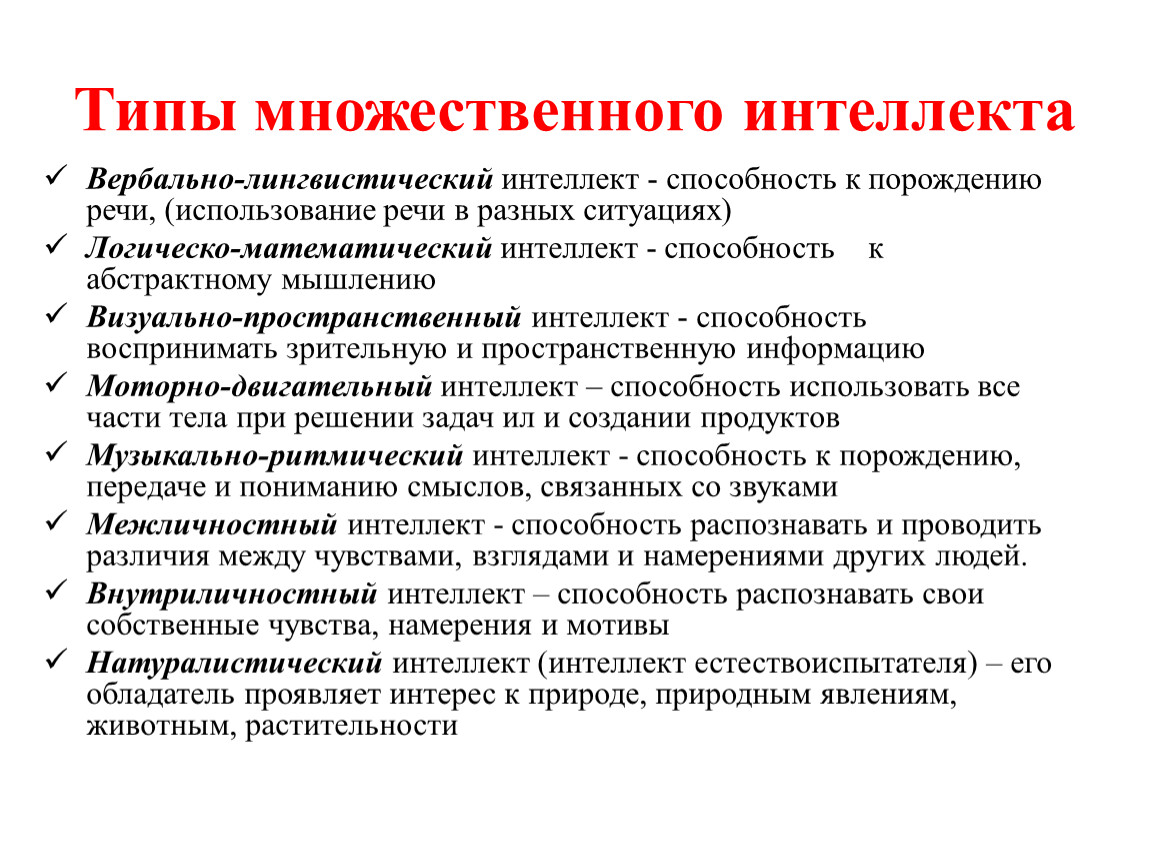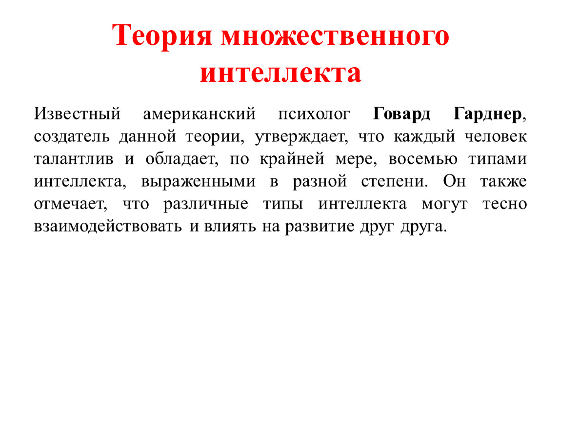 Известный американский психолог Говард Гарднер, создатель данной теории, утверждает, что каждый человек талантлив и обладает, по крайней мере, восемью типами интеллекта, выраженными в разной степени. Он также отмечает, что различные типы интеллекта могут тесно взаимодействовать и влиять на развитие друг друга.