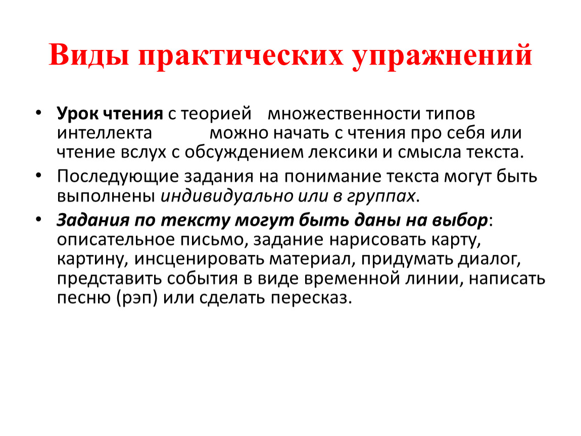 Урок чтения с теорией множественности типов интеллекта можно начать с чтения про себя или чтение вслух с обсуждением лексики и смысла текста.