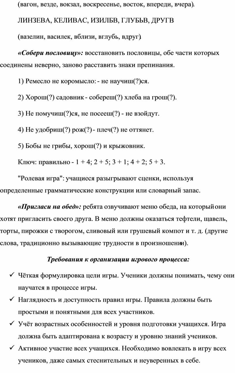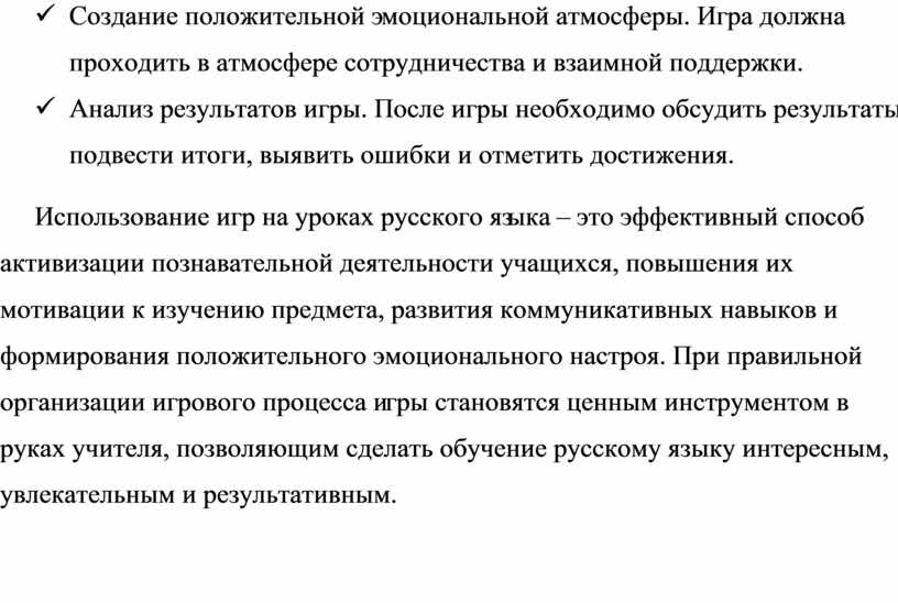 Использование игр на уроках русского языка – это эффективный способ активизации познавательной деятельности учащихся, повышения их мотивации к изучению предмета, развития коммуникативных навыков и формирования положительного эмоционального настроя. При правильной организации игрового процесса игры становятся ценным инструментом в руках учителя, позволяющим сделать обучение русскому языку интересным, увлекательным и результативным.