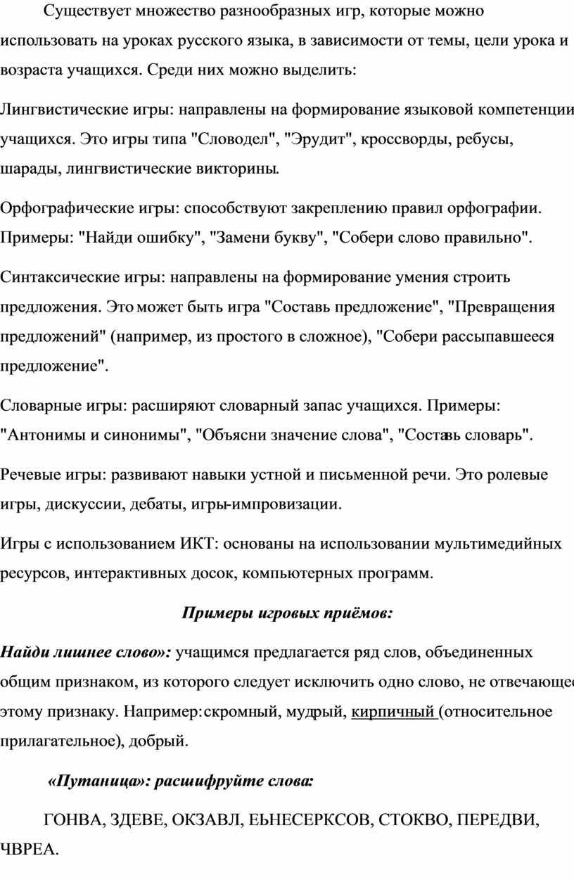 Существует множество разнообразных игр, которые можно использовать на уроках русского языка, в зависимости от темы, цели урока и возраста учащихся. Среди них можно выделить: