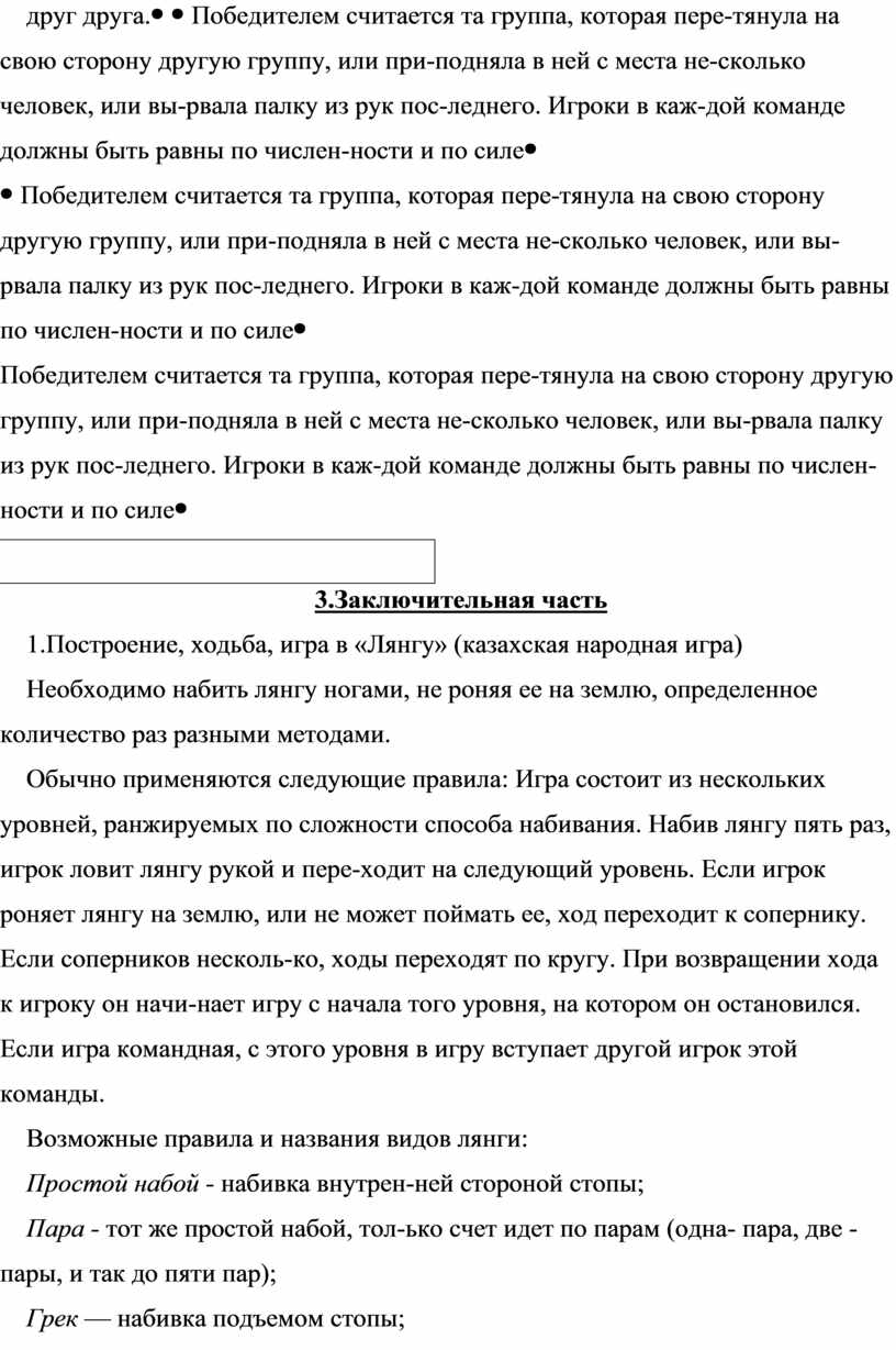 3.Заключительная часть 1.Построение, ходьба, игра в «Лянгу» (казахская народная игра) Необходимо набить лянгу ногами, не роняя ее на землю, определенное количество раз разными методами. Обычно применяются следующие правила: Игра состоит из нескольких уровней, ранжируемых по сложности способа набивания. Набив лянгу пять раз, игрок ловит лянгу рукой и пере-ходит на следующий уровень. Если игрок роняет лянгу на землю, или не может поймать ее, ход переходит к сопернику. Если соперников несколь-ко, ходы переходят по кругу. При возвращении хода к игроку он начи-нает игру с начала того уровня, на котором он остановился. Если игра командная, с этого уровня в игру вступает другой игрок этой команды. Возможные правила и названия видов лянги: Простой набой - набивка внутрен-ней стороной стопы; Пара - тот же простой набой, тол-ько счет идет по парам (одна- пара, две - пары, и так до пяти пар); Грек — набивка подъемом стопы; Сырт - она же косая набивка внешней стороной стопы; Победителем становится игрок или команда, первым прошедшие все ого-воренные уровни (если никто не мог пройти все уровни — достигшие мак-симального уровня). Если несколько игроков проходят все уровни без на-рушений, игра начинается заново, но лянга набивается на каждом уровне не по 5, а по 6 раз, и т. д. до выявле-ния победителя. |