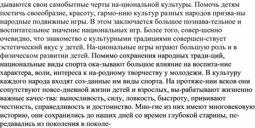 1.Краткая история возникновения национальных игр: В течение истори-ческого пути у каждого народа скла-дываются свои самобытные черты на-циональной культуры. Помочь детям постичь своеобразие, красоту, гармо-нию культур разных народов призва-ны народные подвижные игры. В этом заключается большое познава-тельное и воспитательное значение национальных игр. Более того, совер-шенно очевидно, что знакомство с культурными традициями совершен-ствует эстетический вкус у детей. На-циональные игры играют большую роль и в физическом развитии детей. Помимо сохранения народных тради-ций, национальные виды спорта ока-зывают большое влияние на воспита-ние характера, воли, интереса к на-родному творчеству у молодежи. В культуру каждого народа входят соз-данные им виды спорта. На протяже-нии веков они сопутствуют повсе-дневной жизни детей и взрослых, вы-рабатывают жизненно важные качес-тва: выносливость, силу, ловкость, быстроту, прививают честность, справедливость и достоинство. Мно-гие из них имеют многовековую историю, они сохранились до наших дней со времен глубокой старины, пе-редавались из поколения в поколе-ние, вбирая в себя лучшие национа-льные традиции. Они совершенство-вались по мере хозяйственной де-ятельности человека, по мере совершенствования его разума |