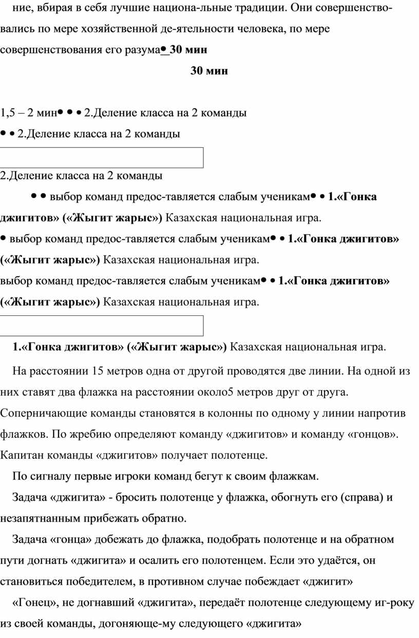 1.«Гонка джигитов» («Жыгит жарыс») Казахская национальная игра. На расстоянии 15 метров одна от другой проводятся две линии. На одной из них ставят два флажка на расстоянии около5 метров друг от друга. Соперничающие команды становятся в колонны по одному у линии напротив флажков. По жребию определяют команду «джигитов» и команду «гонцов». Капитан команды «джигитов» получает полотенце. По сигналу первые игроки команд бегут к своим флажкам. Задача «джигита» - бросить полотенце у флажка, обогнуть его (справа) и незапятнанным прибежать обратно. Задача «гонца» добежать до флажка, подобрать полотенце и на обратном пути догнать «джигита» и осалить его полотенцем. Если это удаётся, он становиться победителем, в противном случае побеждает «джигит» «Гонец», не догнавший «джигита», передаёт полотенце следующему иг-року из своей команды, догоняюще-му следующего «джигита» Выигрывает команда, имеющая больше победителей. |
