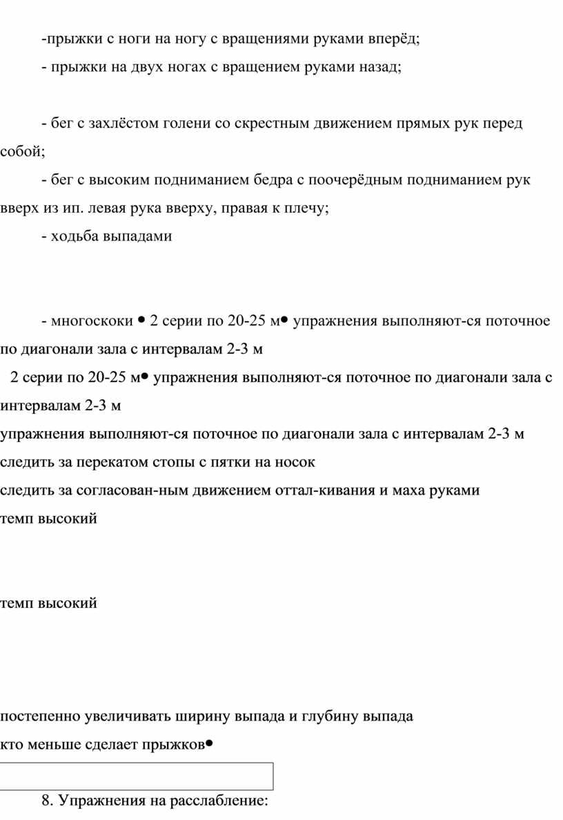 - бег с захлёстом голени со скрестным движением прямых рук перед собой; - бег с высоким подниманием бедра с поочерёдным подниманием рук вверх из ип. левая рука вверху, правая к плечу; - ходьба выпадами
