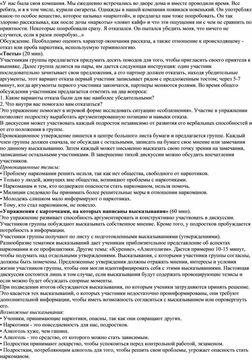 Каждому участнику группы дается карточка с описанием ситуации, в которой подростку кто-либо предлагает попробовать наркотическое вещество. Окончание ситуации отсутствует - его необходимо дописать самому учащемуся.