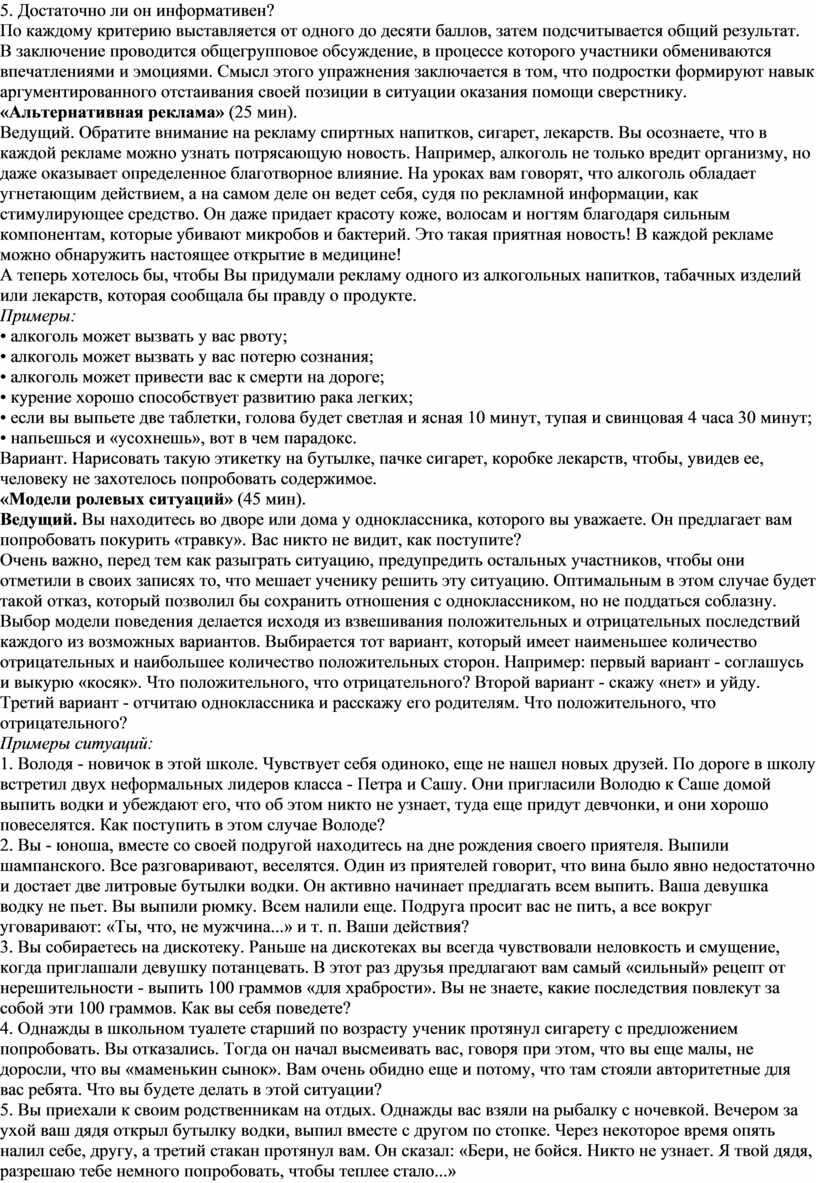 По каждому критерию выставляется от одного до десяти баллов, затем подсчитывается общий результат. В заключение проводится общегрупповое обсуждение, в процессе которого участники обмениваются впечатлениями и эмоциями. Смысл этого упражнения заключается в том, что подростки формируют навык аргументированного отстаивания своей позиции в ситуации оказания помощи сверстнику.