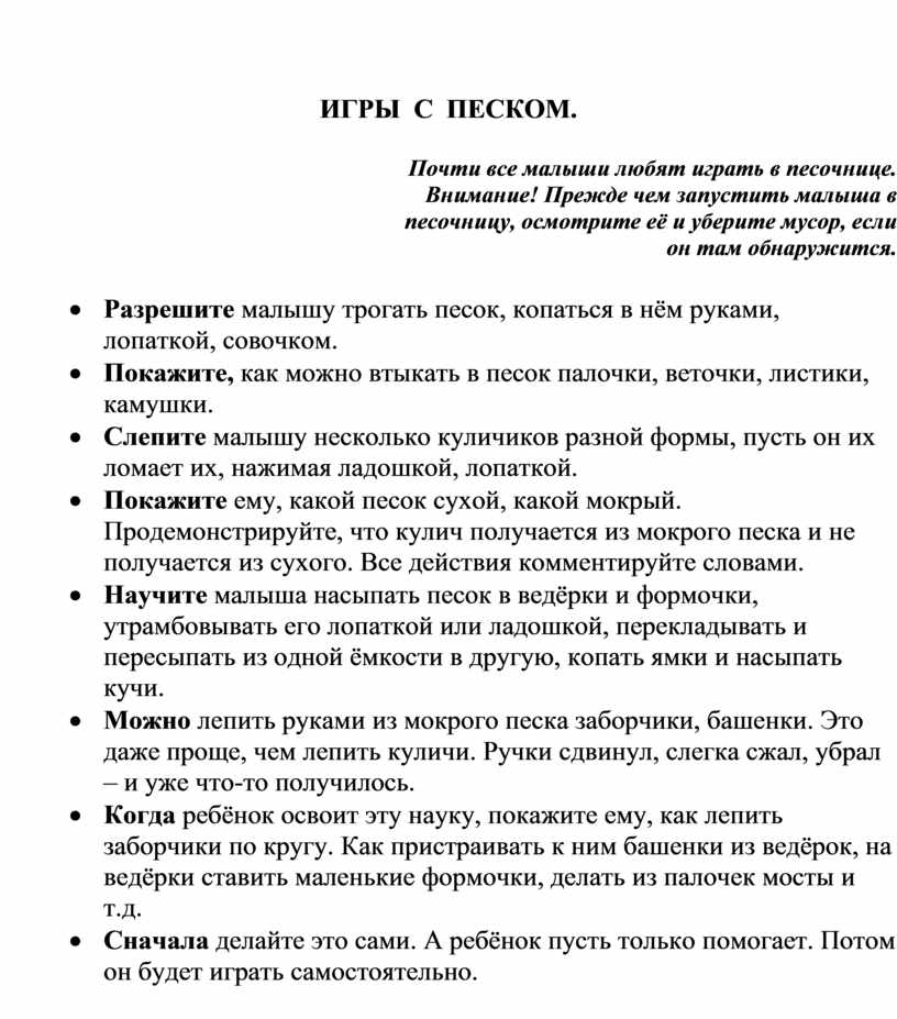 · Научите малыша насыпать песок в ведёрки и формочки, утрамбовывать его лопаткой или ладошкой, перекладывать и пересыпать из одной ёмкости в другую, копать ямки и насыпать кучи.