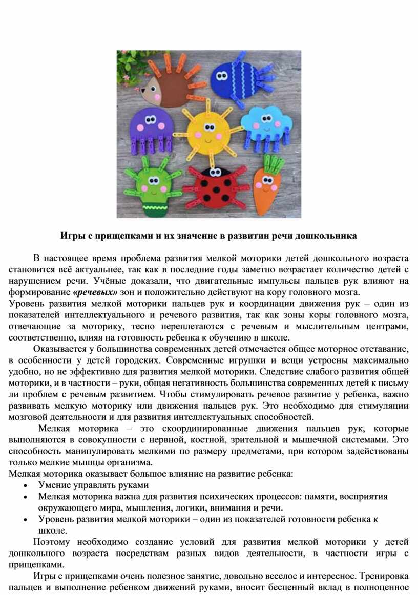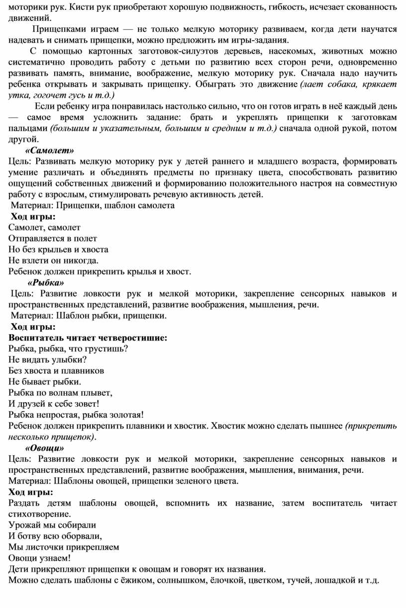 Поэтому необходимо создание условий для развития мелкой моторики у детей дошкольного возраста посредствам разных видов деятельности, в частности игры с прищепками. Игры с прищепками очень полезное занятие, довольно веселое и интересное. Тренировка пальцев и выполнение ребенком движений руками, вносит бесценный вклад в полноценное развитие головного мозга малыша. Прищепка способствует формированию и развитию движения сжимания и разжимания кончиков пальцев обоих рук. Выполняя пальчиками различные движения, ребенок достигает хорошего развития мелкой моторики рук. Кисти рук приобретают хорошую подвижность, гибкость, исчезает скованность движений. Прищепками играем — не только мелкую моторику развиваем, когда дети научатся надевать и снимать прищепки, можно предложить им игры-задания. С помощью картонных заготовок-силуэтов деревьев, насекомых, животных можно систематично проводить работу с детьми по развитию всех сторон речи, одновременно развивать память, внимание, воображение, мелкую моторику рук. Сначала надо научить ребенка открывать и закрывать прищепку. Обыграть это движение (лает собака, крякает утка, гогочет гусь и т.д.) Если ребенку игра понравилась настолько сильно, что он готов играть в неё каждый день — самое время усложнить задание: брать и укреплять прищепки к заготовкам пальцами (большим и указательным, большим и средним и т.д.) сначала одной рукой, потом другой. «Самолет» Цель: Развивать мелкую моторику рук у детей раннего и младшего возраста, формировать умение различать и объединять предметы по признаку цвета, способствовать развитию ощущений собственных движений и формированию положительного настроя на совместную работу с взрослым, стимулировать речевую активность детей. Материал: Прищепки, шаблон самолета Ход игры: Самолет, самолет Отправляется в полет Но без крыльев и хвоста Не взлети он никогда. Ребенок должен прикрепить крылья и хвост. «Рыбка» Цель: Развитие ловкости рук и мелкой моторики, закрепление сенсорных навыков и пространственных представлений, развитие воображения, мышления, речи. Материал: Шаблон рыбки, прищепки. Ход игры: Воспитатель читает четверостишие: Рыбка, рыбка, что грустишь? Не видать улыбки? Без хвоста и плавников Не бывает рыбки. Рыбка по волнам плывет, И друзей к себе зовет! Рыбка непростая, рыбка золотая! Ребенок должен прикрепить плавники и хвостик. Хвостик можно сделать пышнее (прикрепить несколько прищепок). «Овощи» Цель: Развитие ловкости рук и мелкой моторики, закрепление сенсорных навыков и пространственных представлений, развитие воображения, мышления, внимания, речи. Материал: Шаблоны овощей, прищепки зеленого цвета. Ход игры: Раздать детям шаблоны овощей, вспомнить их название, затем воспитатель читает стихотворение. Урожай мы собирали И ботву всю оборвали, Мы листочки прикрепляем Овощи узнаем! Дети прикрепляют прищепки к овощам и говорят их названия. Можно сделать шаблоны с ёжиком, солнышком, ёлочкой, цветком, тучей, лошадкой и т.д. |