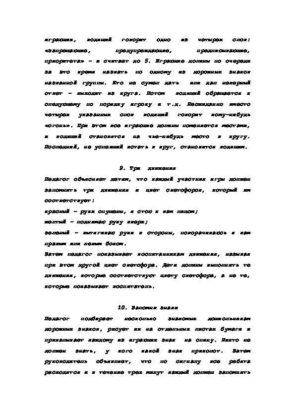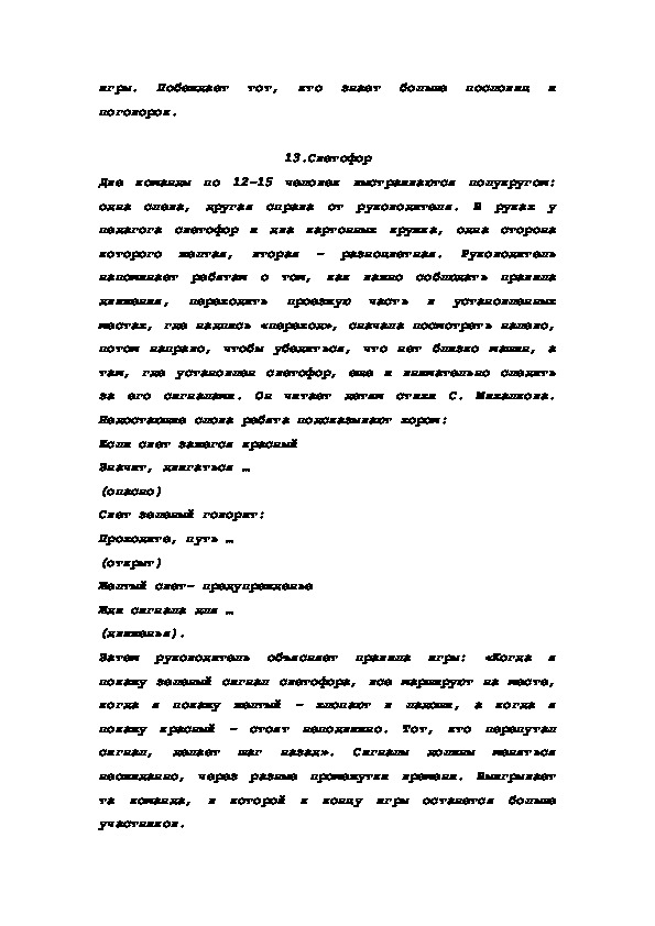Затем руководитель объясняет правила игры: «Когда я покажу зеленый сигнал светофора, все маршируют на месте, когда я покажу желтый - хлопают в ладоши, а когда я покажу красный – стоят неподвижно. Тот, кто перепутал сигнал, делает шаг назад». Сигналы должны меняться неожиданно, через разные промежутки времени. Выигрывает та команда, в которой к концу игры останется больше участников.