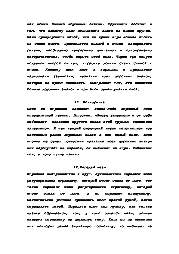 Педагог подбирает несколько знакомых дошкольникам дорожных знаков, рисует их на отдельных листах бумаги и прикалывает каждому из играющих знак на спину. Никто не должен знать, у кого какой знак приколот. Затем руководитель объявляет, что по сигналу все ребята расходятся и в течение трех минут каждый должен запомнить как можно больше дорожных знаков. Трудность состоит в том, что каждому надо подглядеть знаки на спине других. Надо предупредить детей, что во время игры нельзя стоять на одном месте, прислонятся спиной к стене, задерживать руками, необходимо непрерывно двигаться и одновременно изворачиваться, чтобы скрыть свой знак. Через три минуты подается второй сигнал, играющие должны стать спиной к стене. Каждому дают лист и карандаш и предлагают нарисовать (записать) названия всех дорожных знаков, которые он сумел запомнить. Выигрывает тот, кто запомнил больше дорожных знаков и при этом сумел утаить свой.