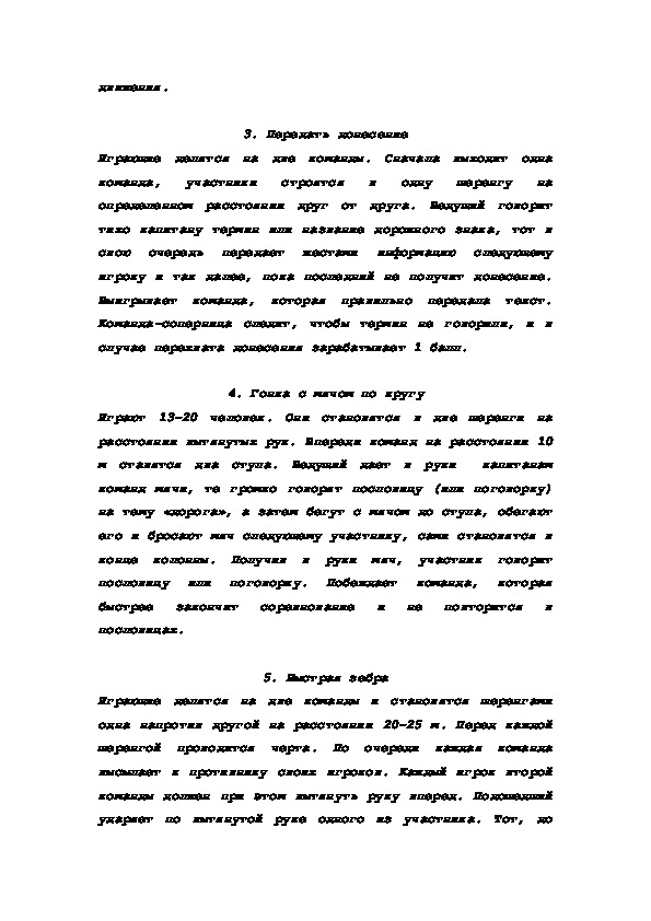 Играющие делятся на две команды. Сначала выходит одна команда, участники строятся в одну шеренгу на определенном расстоянии друг от друга. Ведущий говорит тихо капитану термин или название дорожного знака, тот в свою очередь передает жестами информацию следующему игроку и так далее, пока последний не получит донесение. Выигрывает команда, которая правильно передала текст. Команда-соперница следит, чтобы термин не говорили, и в случае перехвата донесения зарабатывает 1 балл.