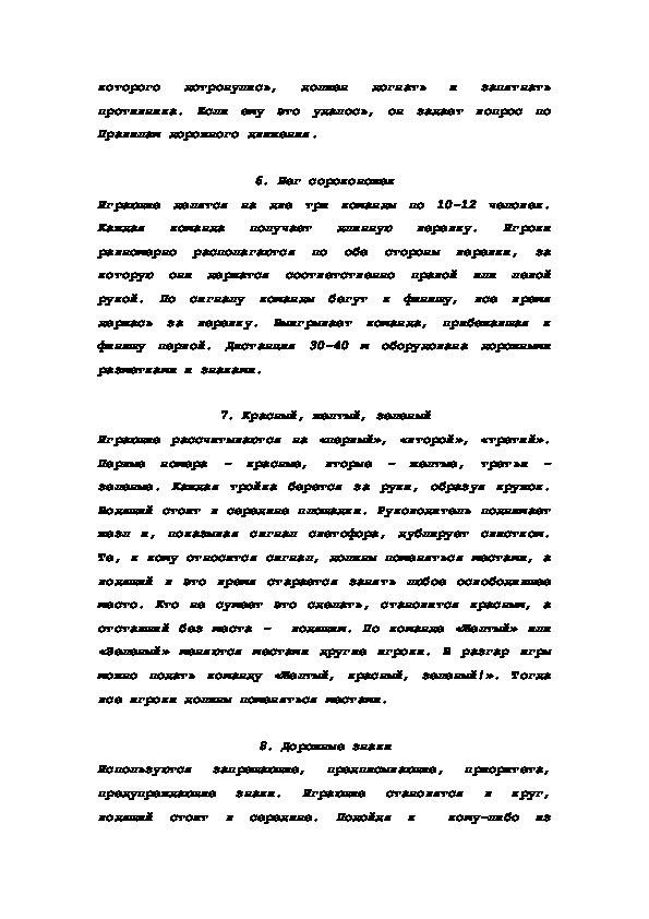 Играющие рассчитываются на «первый», «второй», «третий». Первые номера – красные, вторые – желтые, третьи – зеленые. Каждая тройка берется за руки, образуя кружок. Водящий стоит в середине площадки. Руководитель поднимает жезл и, показывая сигнал светофора, дублирует свистком. Те, к кому относится сигнал, должны поменяться местами, а водящий в это время старается занять любое освободившее место. Кто не сумеет это сделать, становится красным, а отставший без места - водящим. По команде «Желтый» или «Зеленый» меняются местами другие игроки. В разгар игры можно подать команду «Желтый, красный, зеленый!». Тогда все игроки должны поменяться местами.
