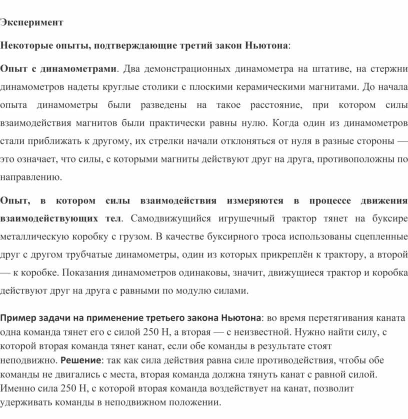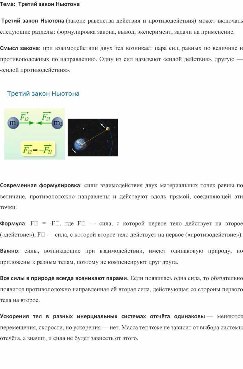 Третий закон Ньютона (законе равенства действия и противодействия) может включать следующие разделы: формулировка закона, вывод, эксперимент, задачи на применение.