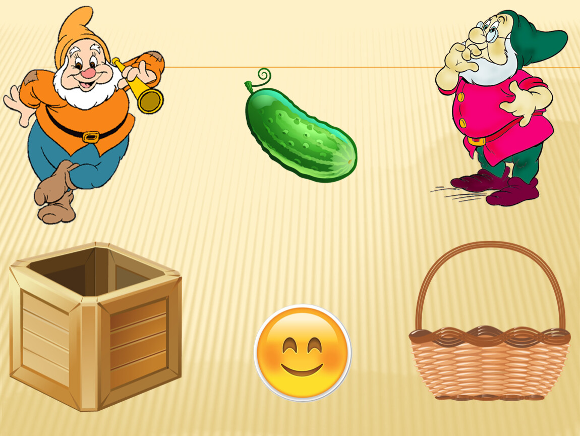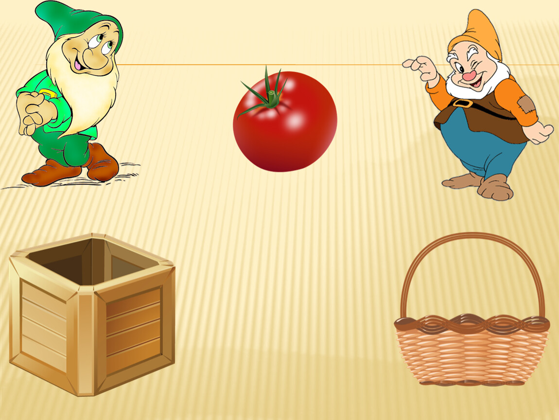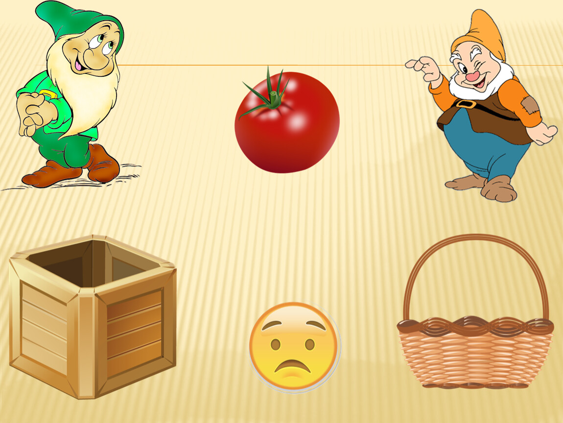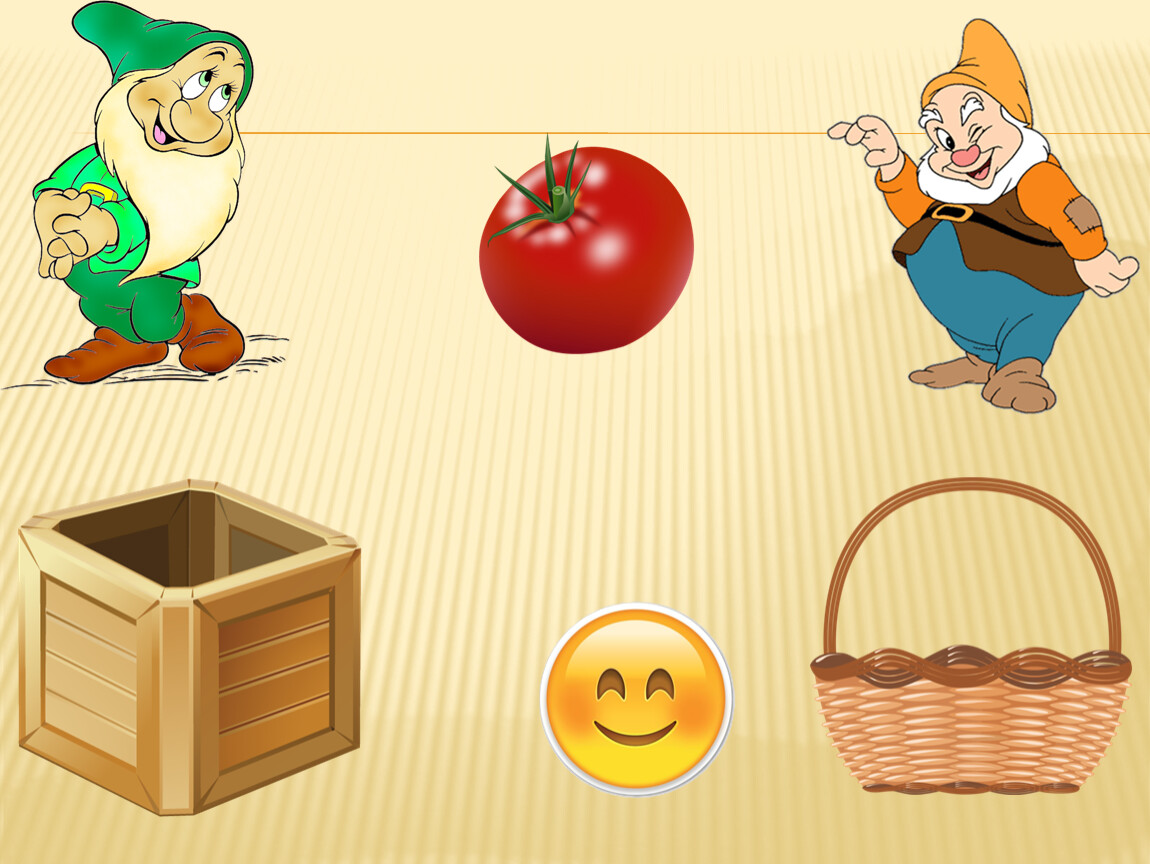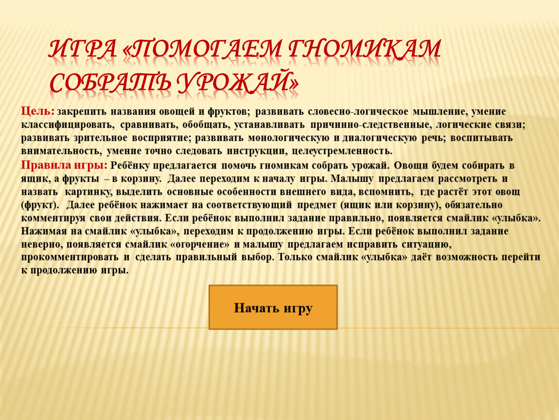 Правила игры: Ребёнку предлагается помочь гномикам собрать урожай. Овощи будем собирать в ящик, а фрукты – в корзину. Далее переходим к началу игры. Малышу предлагаем рассмотреть и назвать картинку, выделить основные особенности внешнего вида, вспомнить, где растёт этот овощ (фрукт). Далее ребёнок нажимает на соответствующий предмет (ящик или корзину), обязательно комментируя свои действия. Если ребёнок выполнил задание правильно, появляется смайлик «улыбка». Нажимая на смайлик «улыбка», переходим к продолжению игры. Если ребёнок выполнил задание неверно, появляется смайлик «огорчение» и малышу предлагаем исправить ситуацию, прокомментировать и сделать правильный выбор. Только смайлик «улыбка» даёт возможность перейти к продолжению игры.